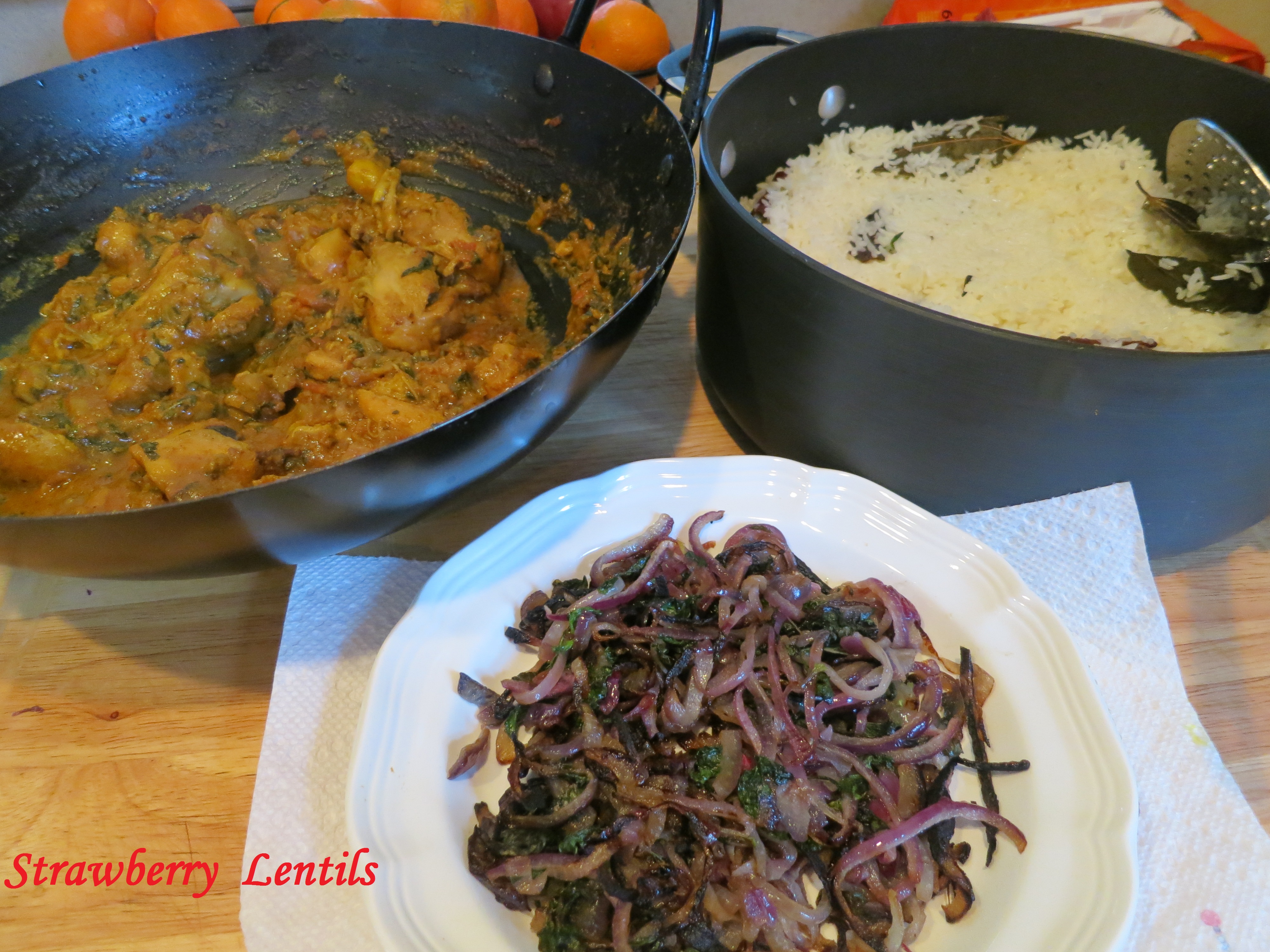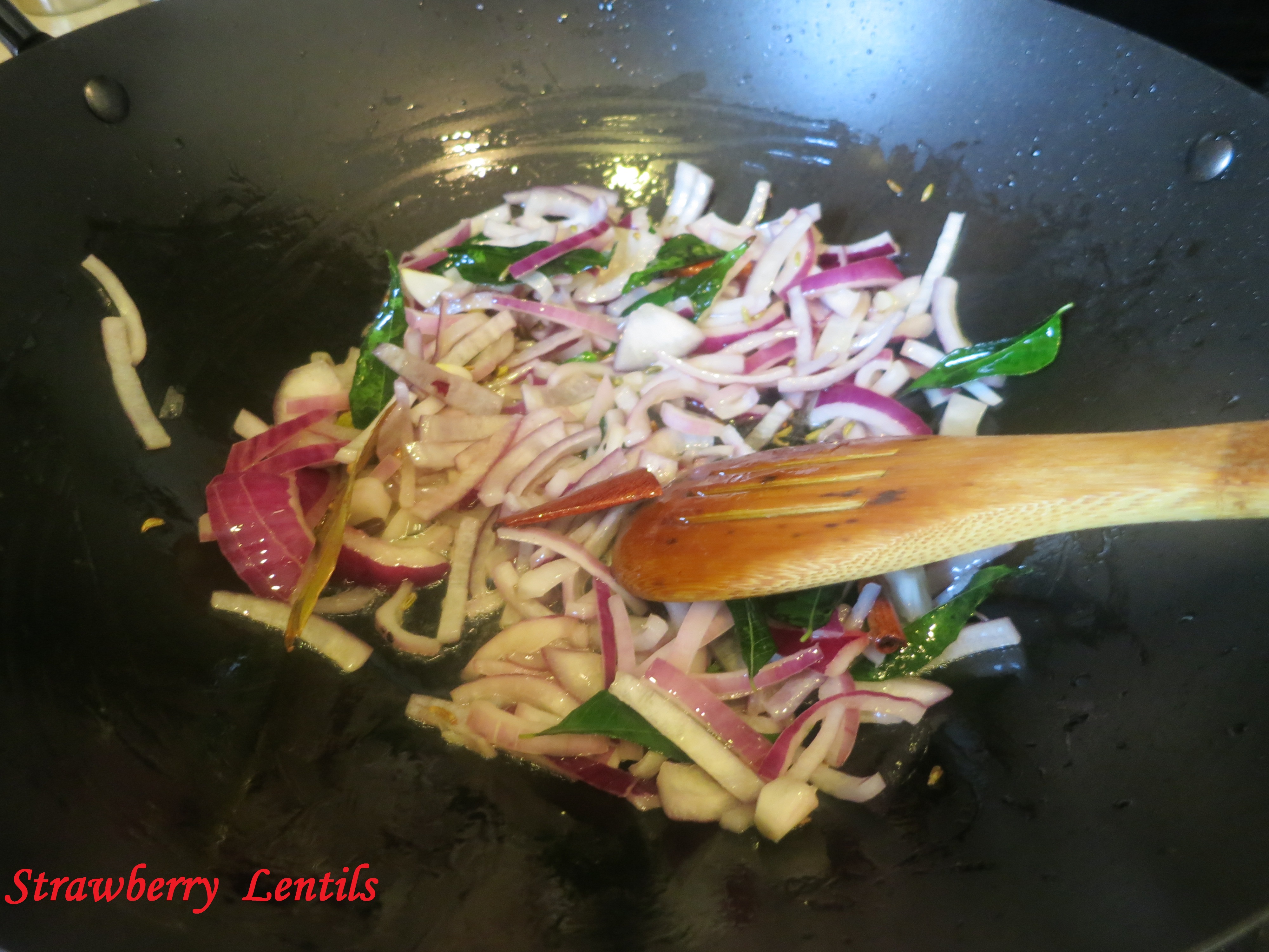 Bay leaves, Cardamom, Cinnamon, Cloves and Fennel. Saute onions, green chillies, curry leaves and 2 tbsp. of ginger garlic paste.