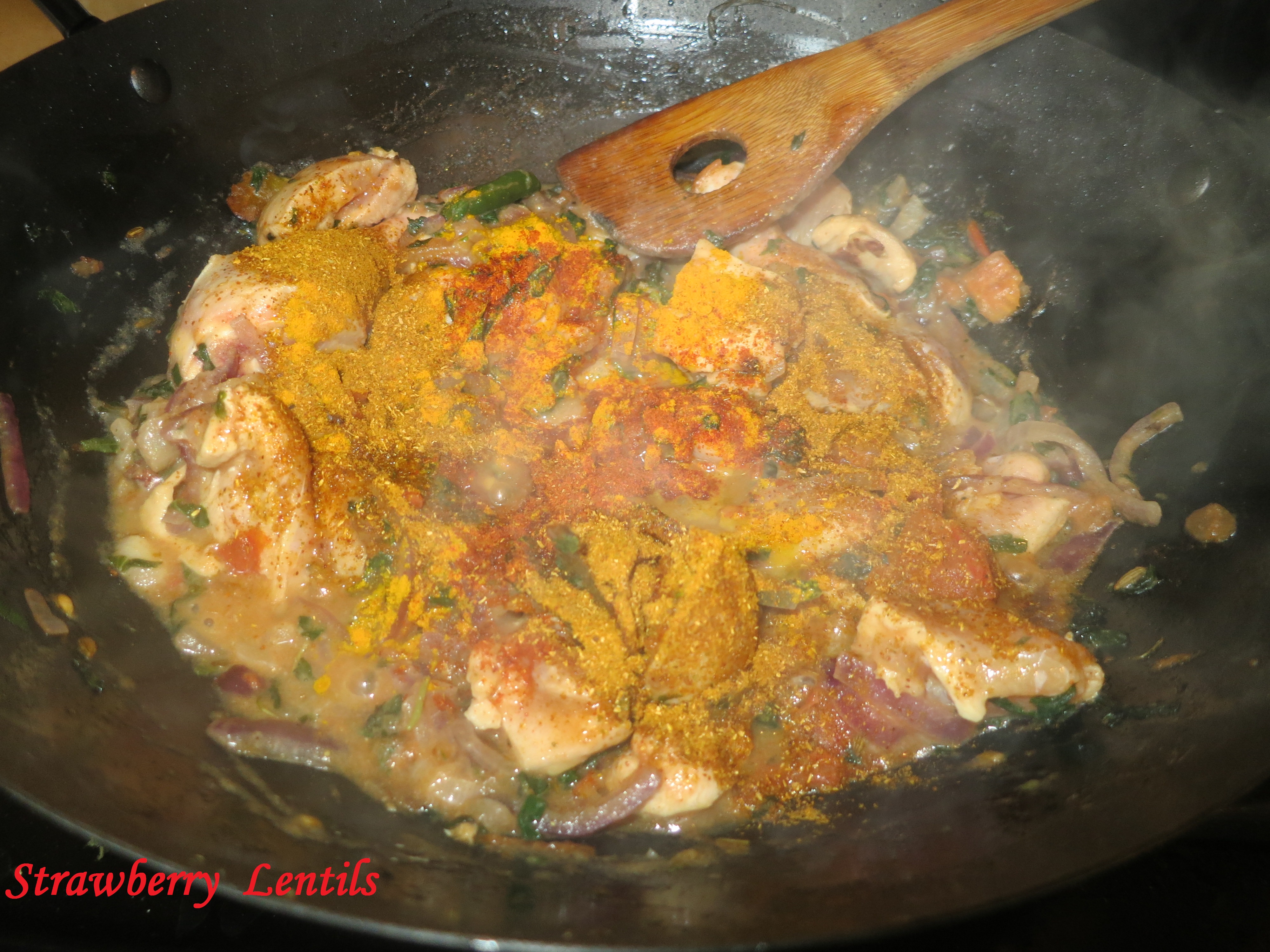 10. When tomatoes soften , add chicken. When chicken begins to change color, add turmeric, red chilli powder, coriander powder, garam masala.I would add very little coriander powder. If you have a good chicken curry masala, you can add that too.