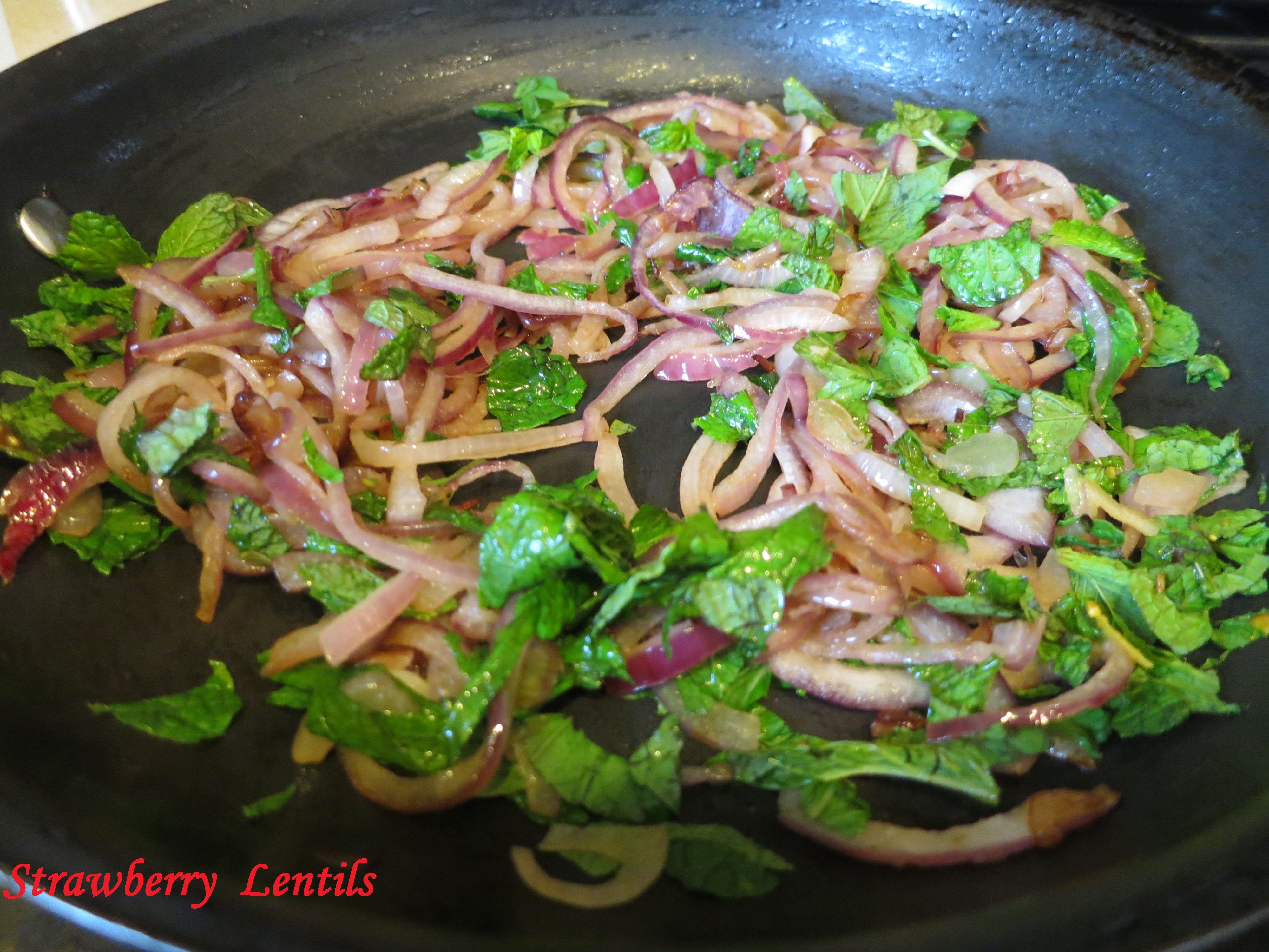 14. In a pan, heat up a spoon of oil and sauté the onions. when the onions brown , add the mint.