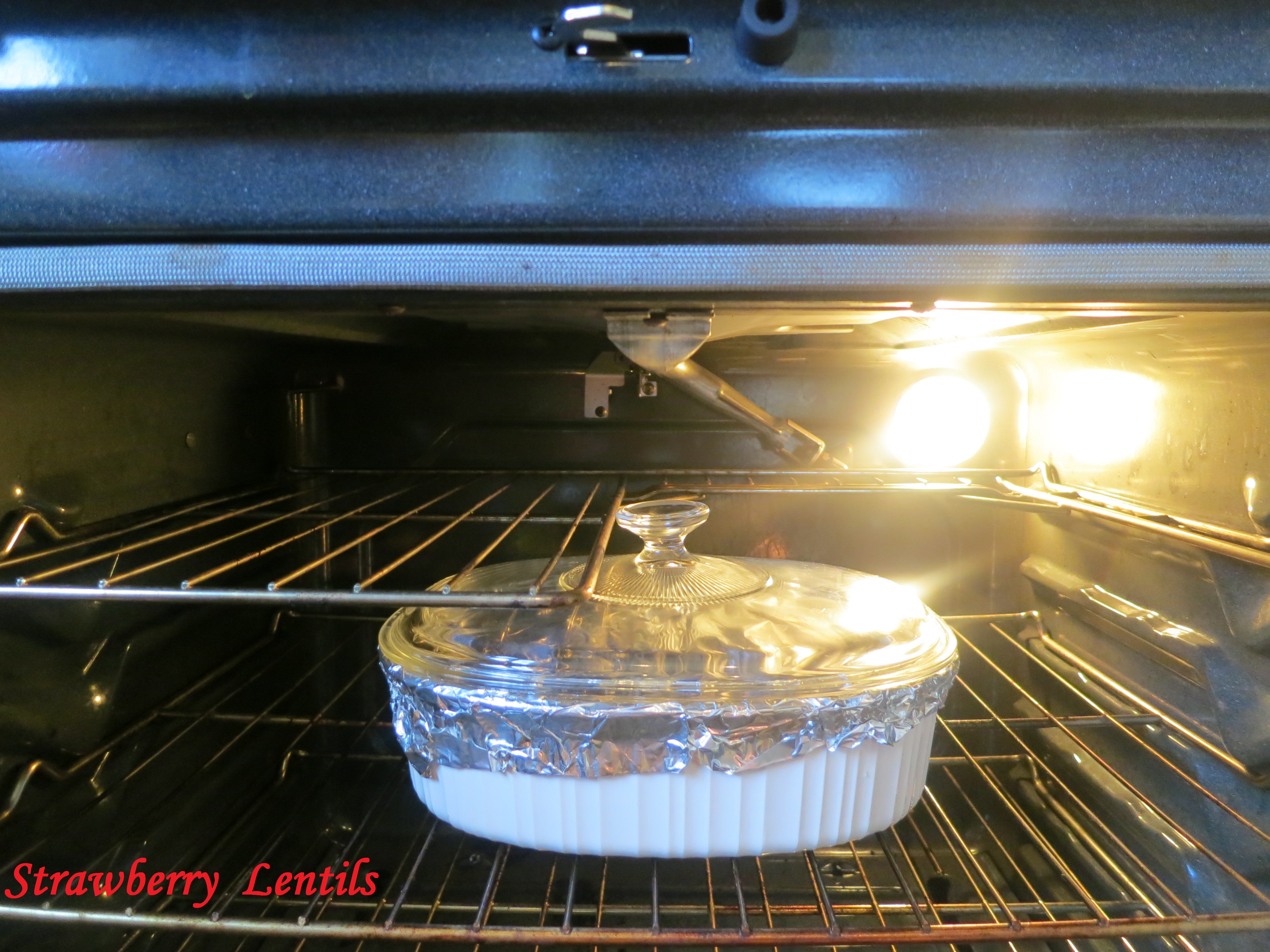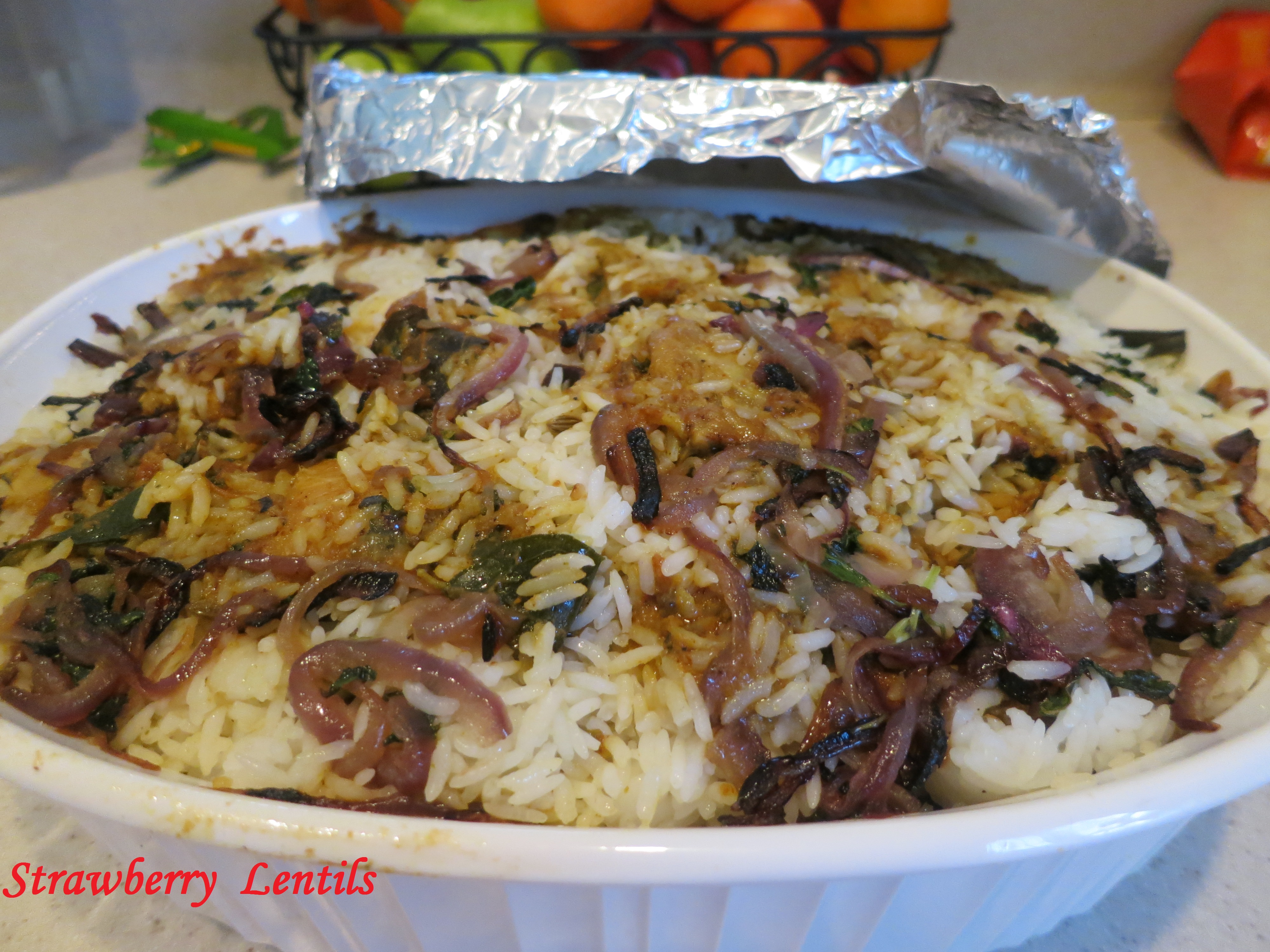 17. Roughly for 3 cups of rice, you should be able to repeat the layers atleast 3 times. Cover the dish tightly with foil.Place the lid over the foil. Make sure its sealed tight. Else, the rice and meat will lose moisture and we will end up with a very dry biriyani. Bake in the oven at 300 degrees F for 1 hour.