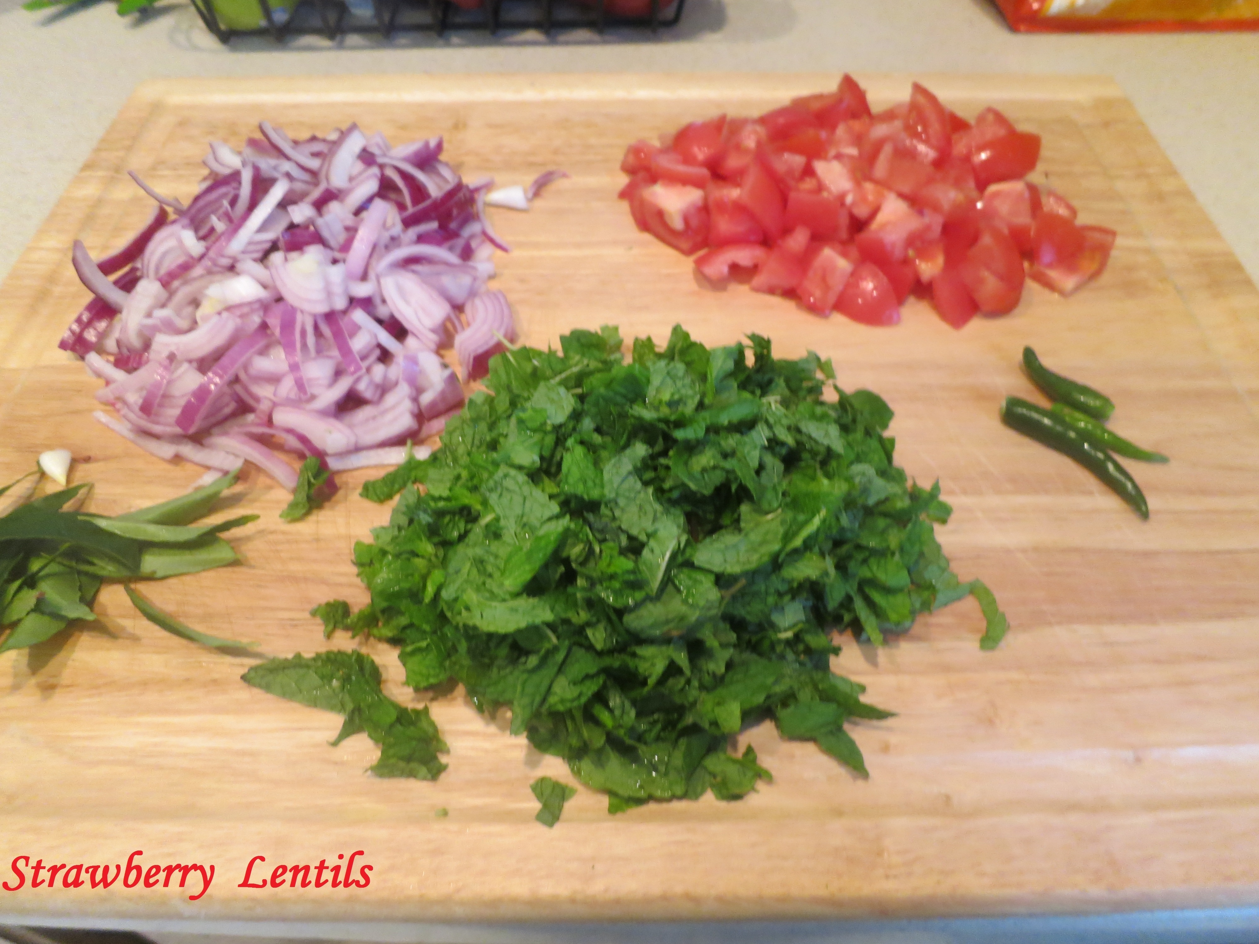 7. Chop : Onions, Tomatoes, Green chillies,  Mint, Curry leaves, Coriander leaves(optional)