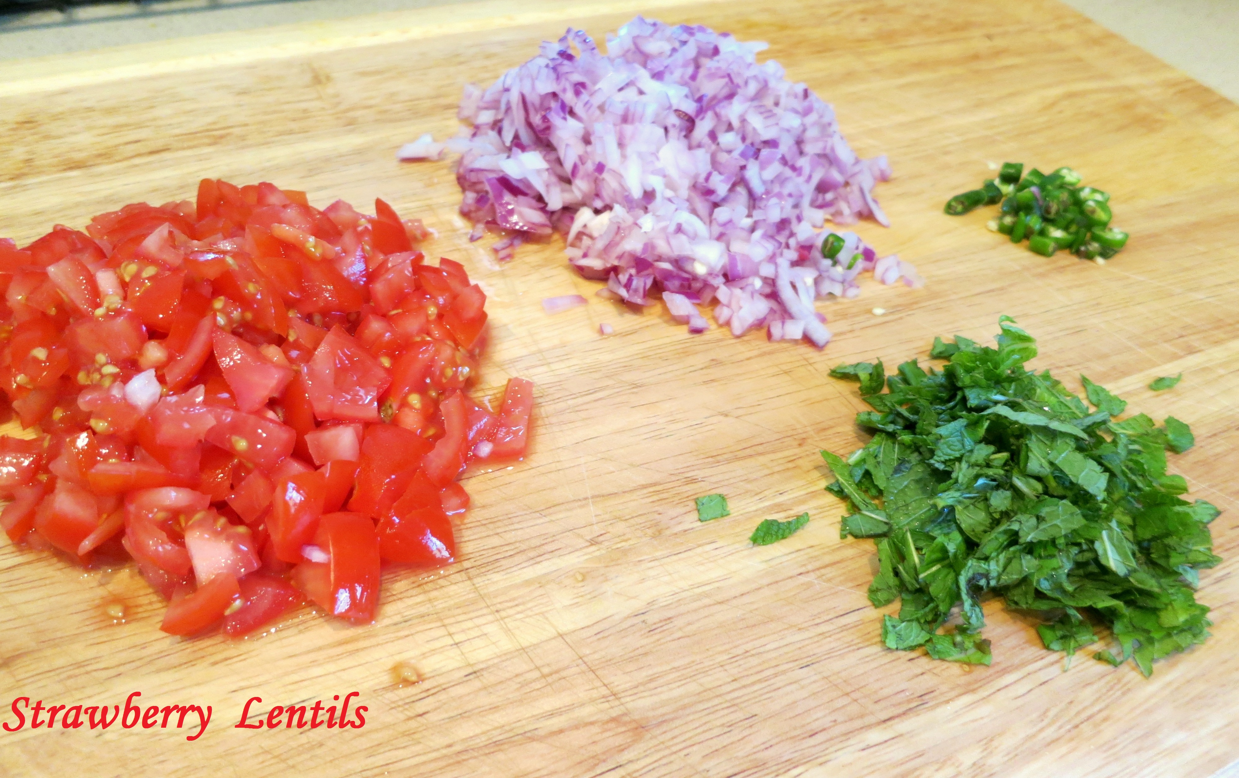 Tomatoes, onions, green chillies and mint chopped.Image