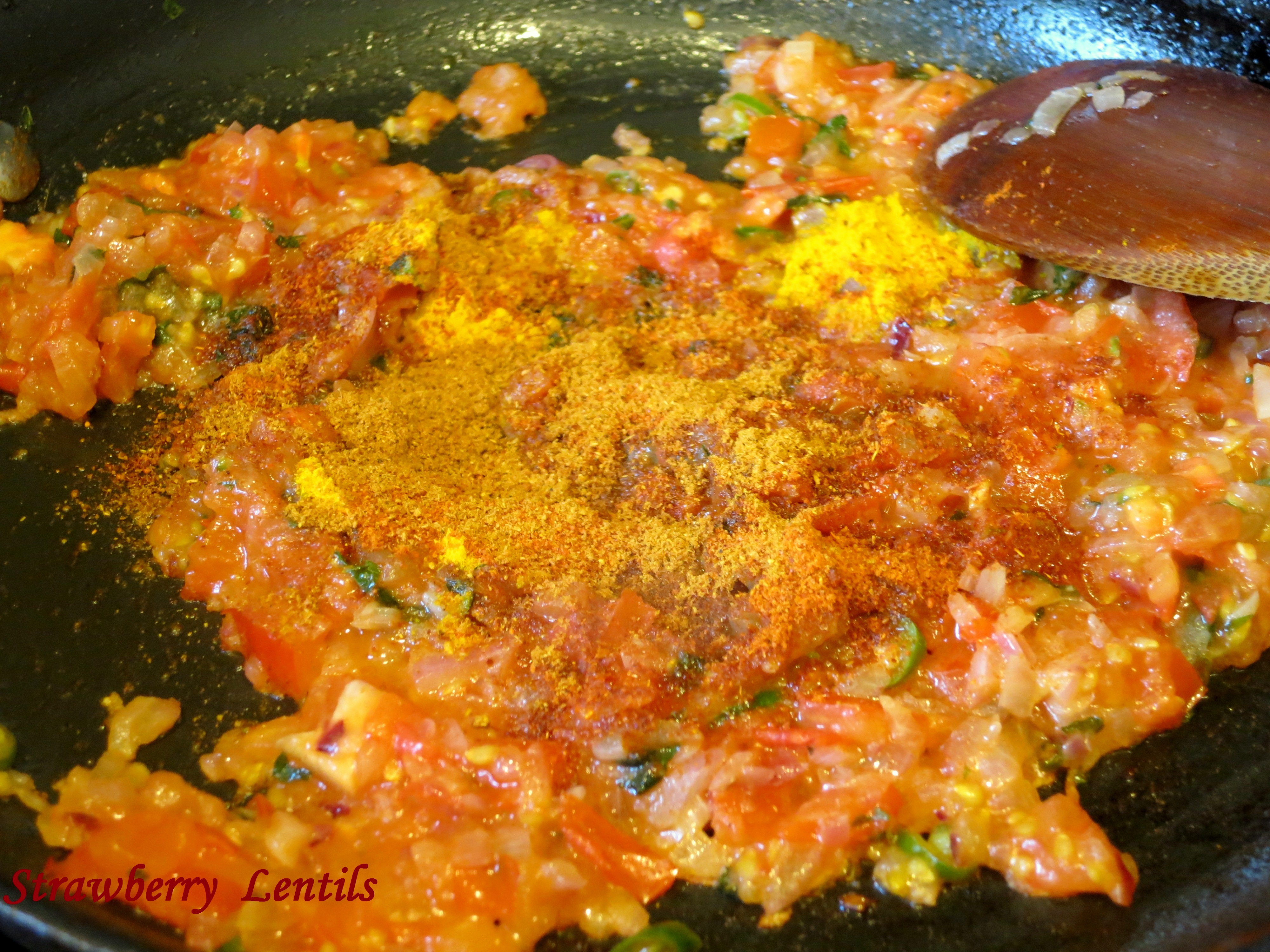 Add the tomatoes. When the tomatoes soften, add turmeric powder, chilli powder, garam masala and salt.Image