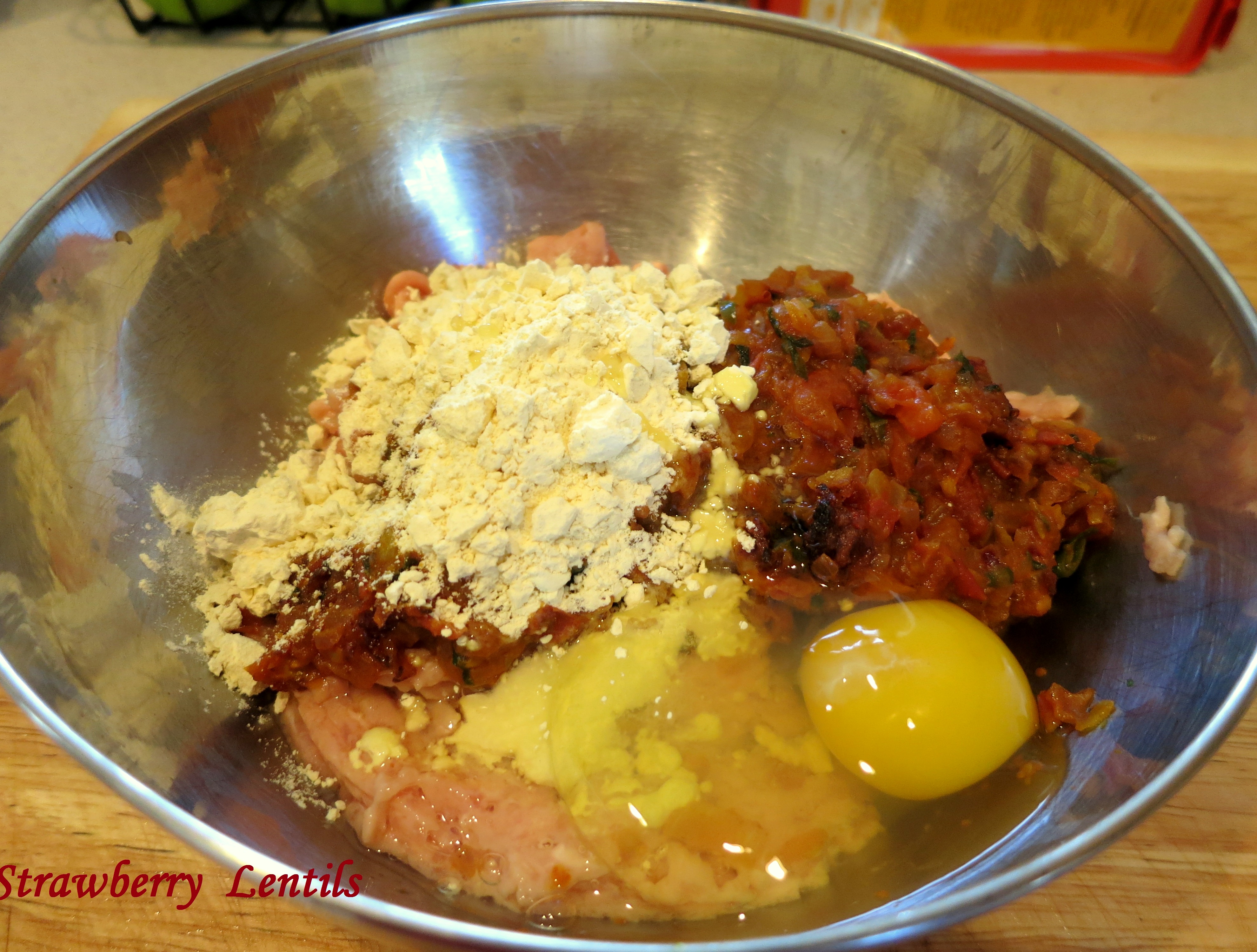 Add the onion-tomato mixture , 1 tbsp. of besan (chick peas flour/gram flour) and an egg and mix well. Add breadcrumbs if the mixture is too loose.Image