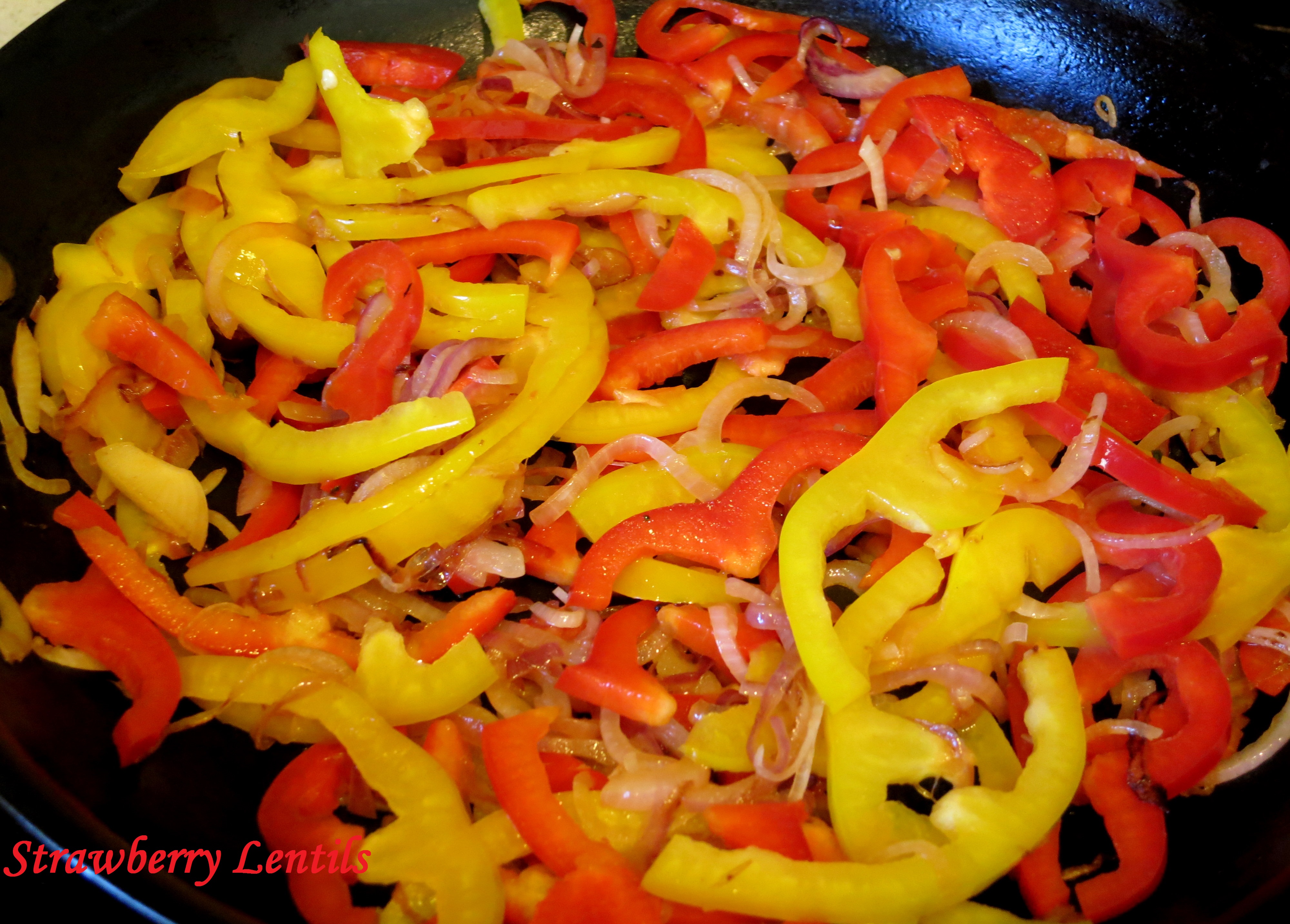 Saute the onions and when they turn light brown, saute the peppers.Image