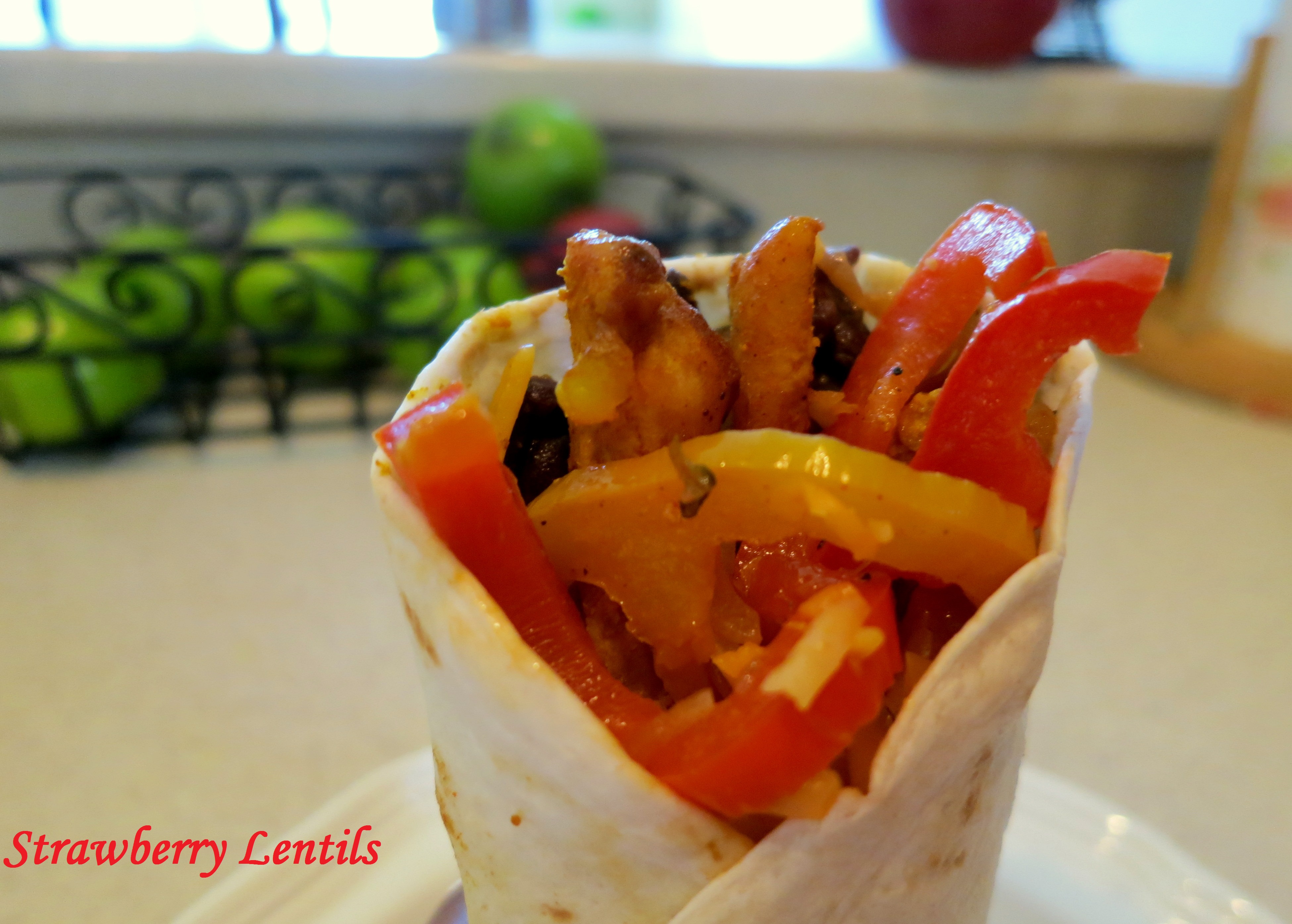 Now you just have to put everything together. You can serve with condiments like guacamole, sour cream or salsa. But just this is good enough, as you get the sweet and tangy from the peppers and green apples and all those spices from the chicken and beans.Image