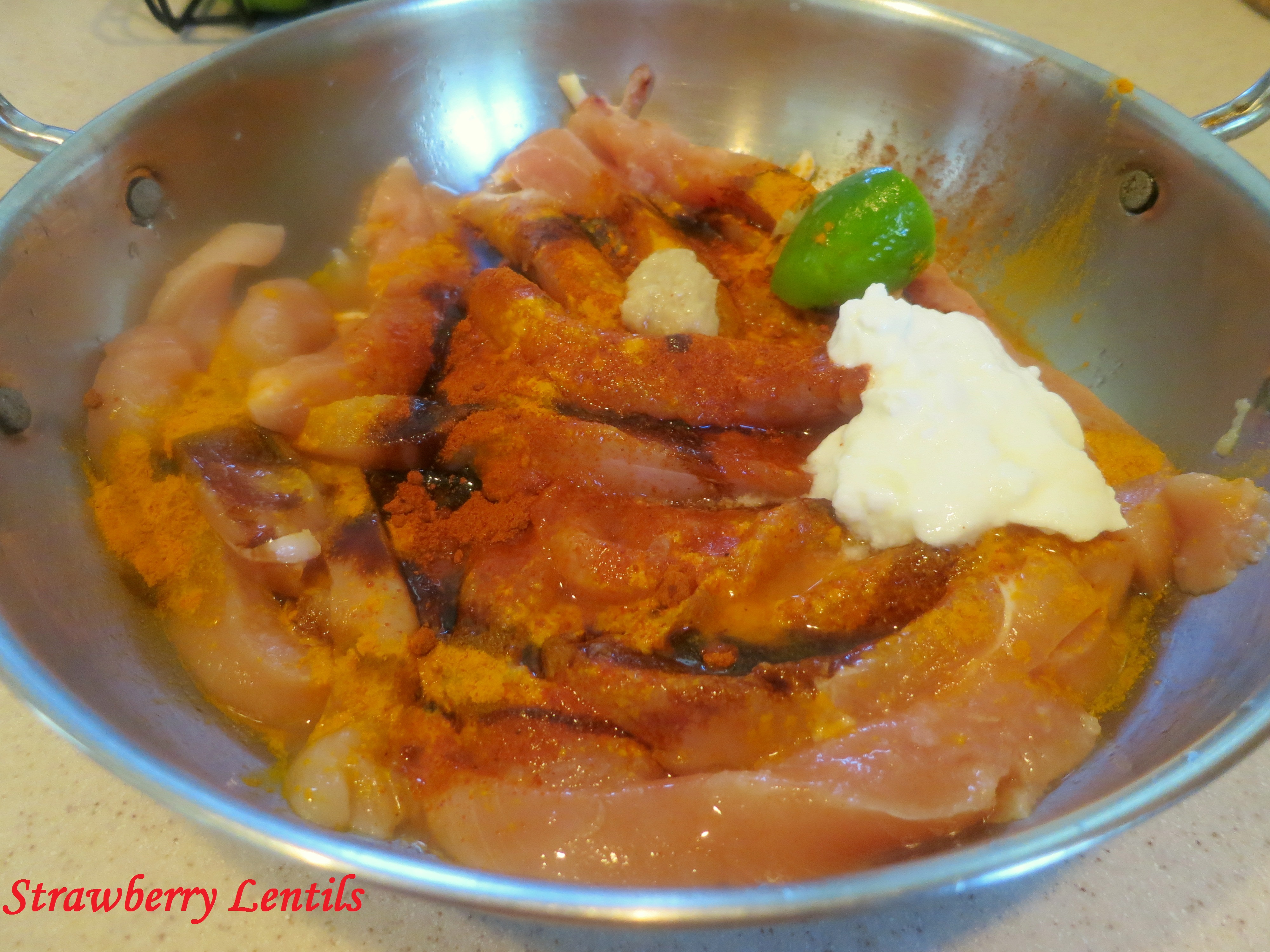 Marinate with : Turmeric powder, Chilli powder, dark soy, 1/2 tsp of gingergarlic paste, lemon juice, yogurt and salt. Image