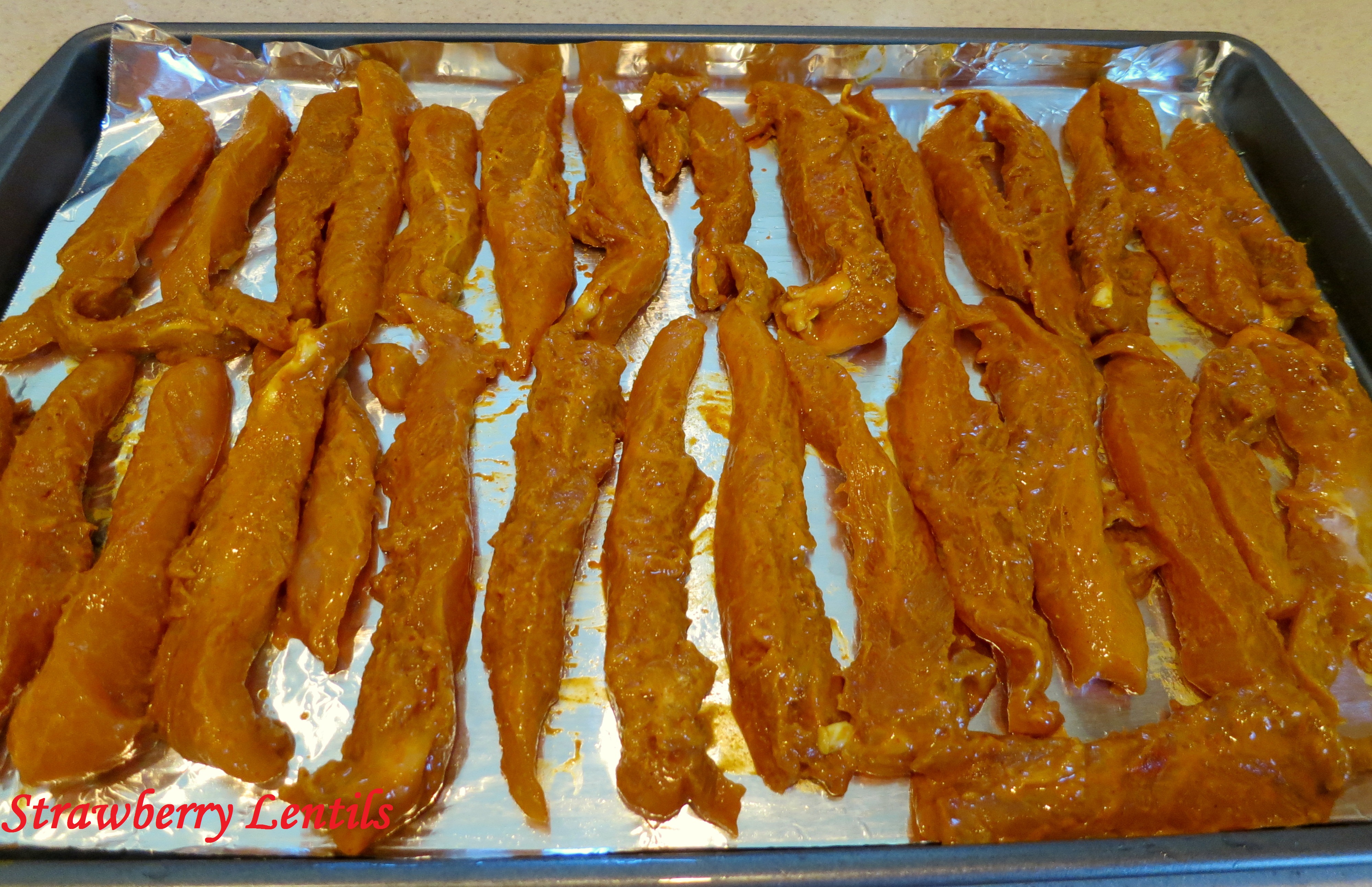 Let it sit for at least 30 mins, more the better. Lay the strips down on a cookie sheet and bake at 350 degrees .Image