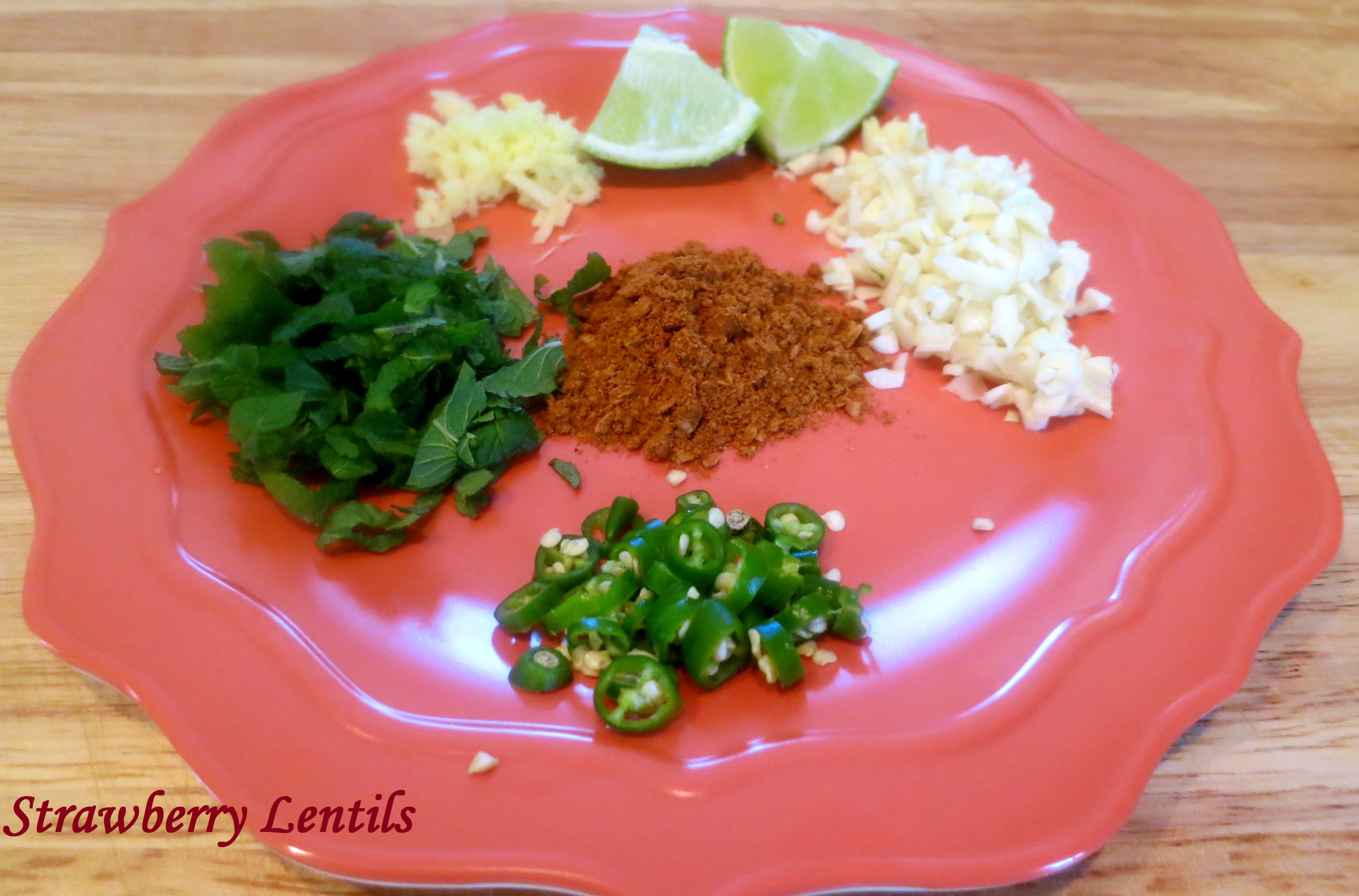 For the black beans : minced ginger, minced garlic, minced green chillies, lime and minced herbs (I have mint here). The powder I have in the middle is taco seasoning. If you do not have it, you can mix chilli powder, garlic powder, cocoa and brown sugar. If you don’t want to take that route, you can use channa masala too.Image