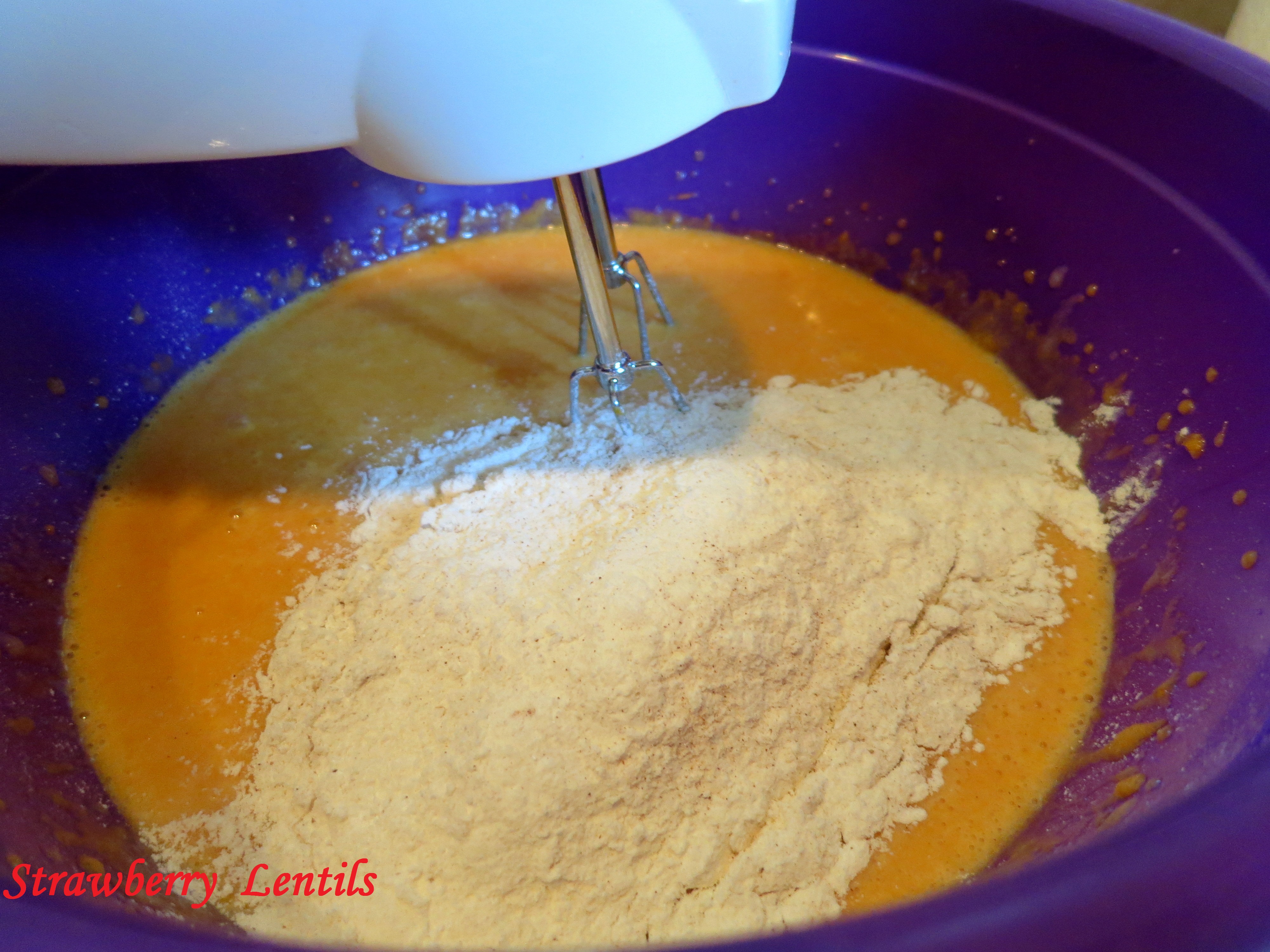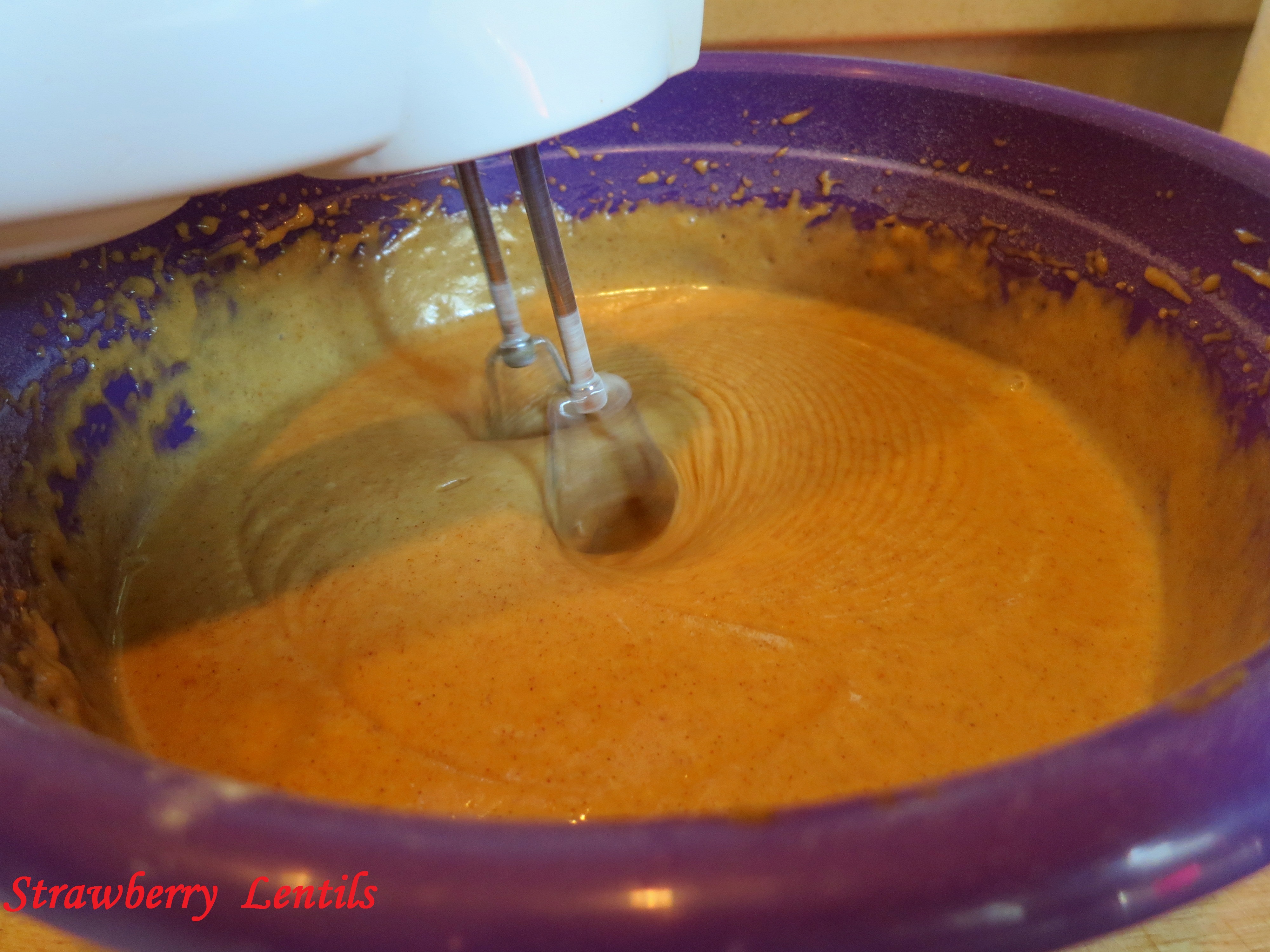After blending in all four eggs, add the pumpkin.Image