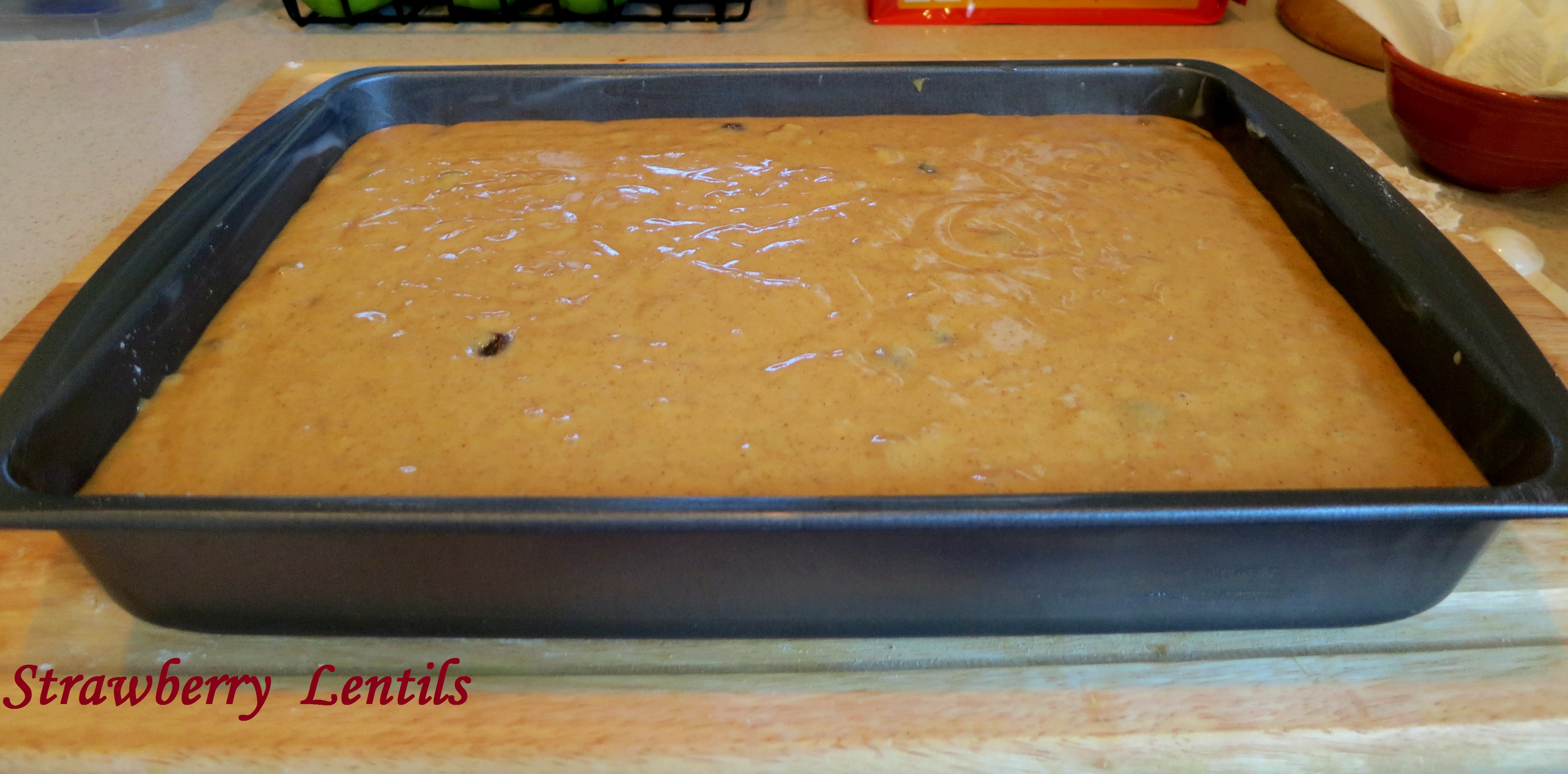 Grease and dust a cake pan. You can also use loaf pans.Pour the cake mix into the pan and bake at 350 degrees. It took little over an hour to get done. If you are using loaf pans, it will take less time.Image