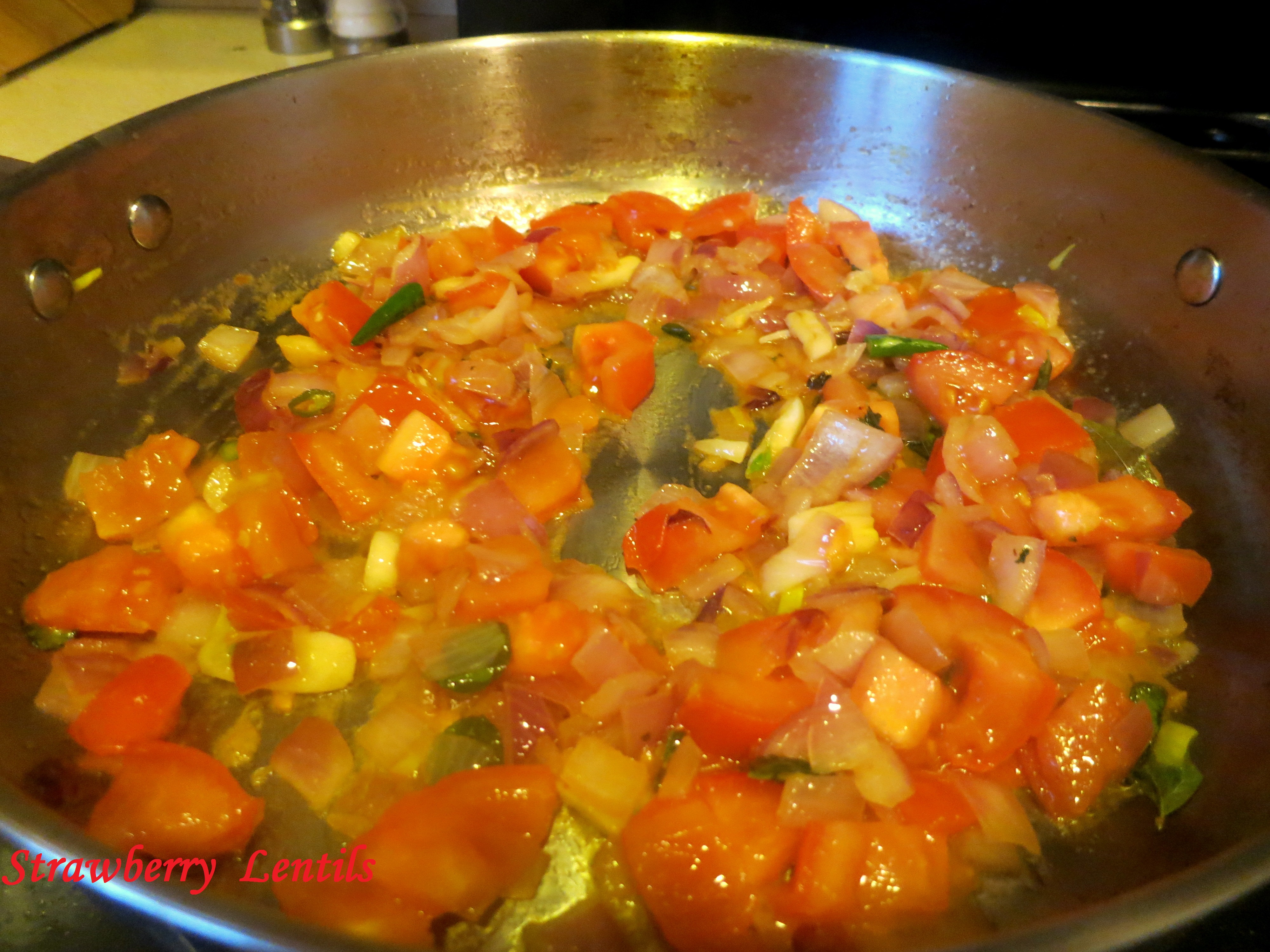 chop some onions, garlic, chillies, tomatoes and curry leaves.