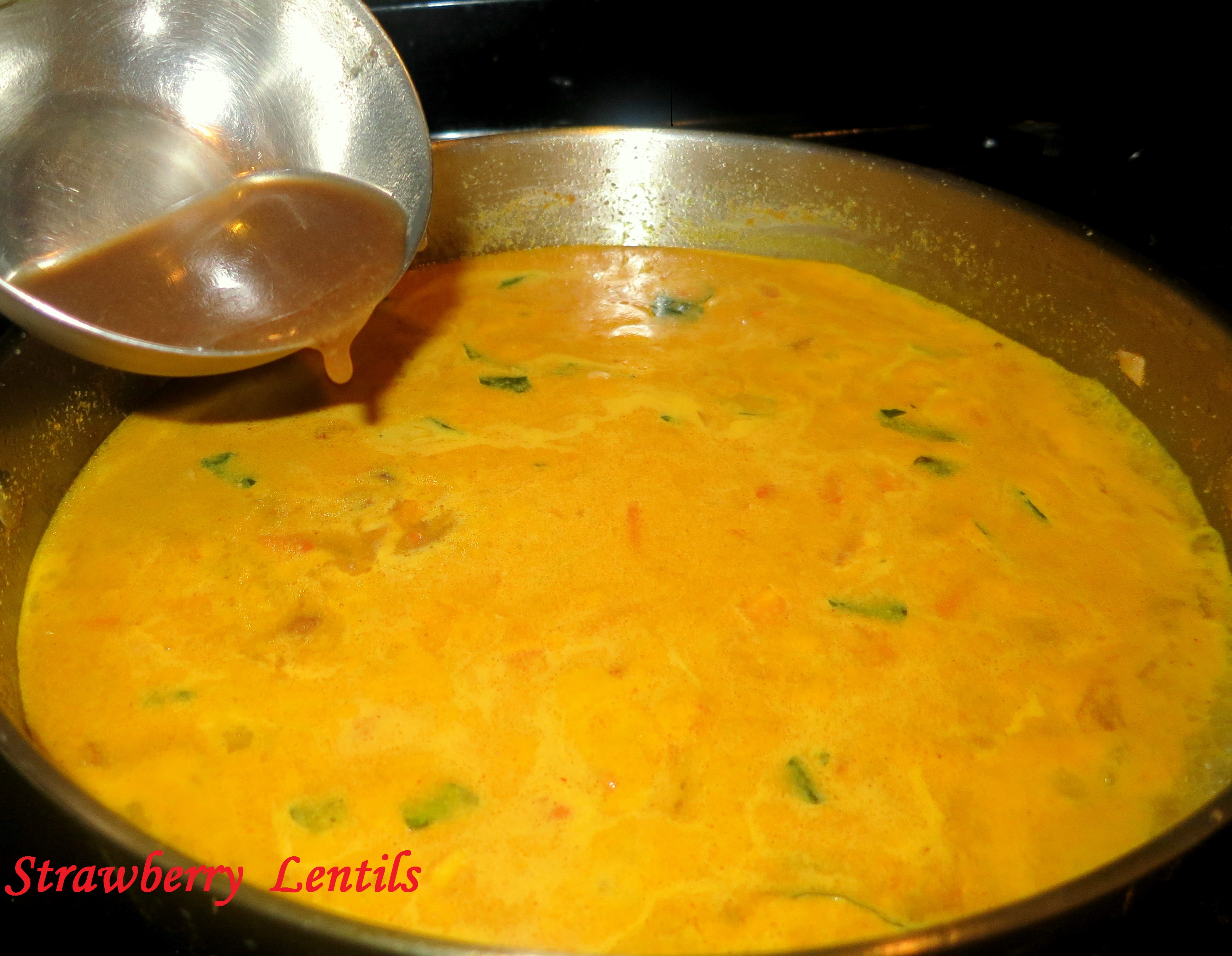 Use a shallow pan(so that all the kolas can be placed in a single layer). Saute the garlic, curry leaves ,chillies  and onions.