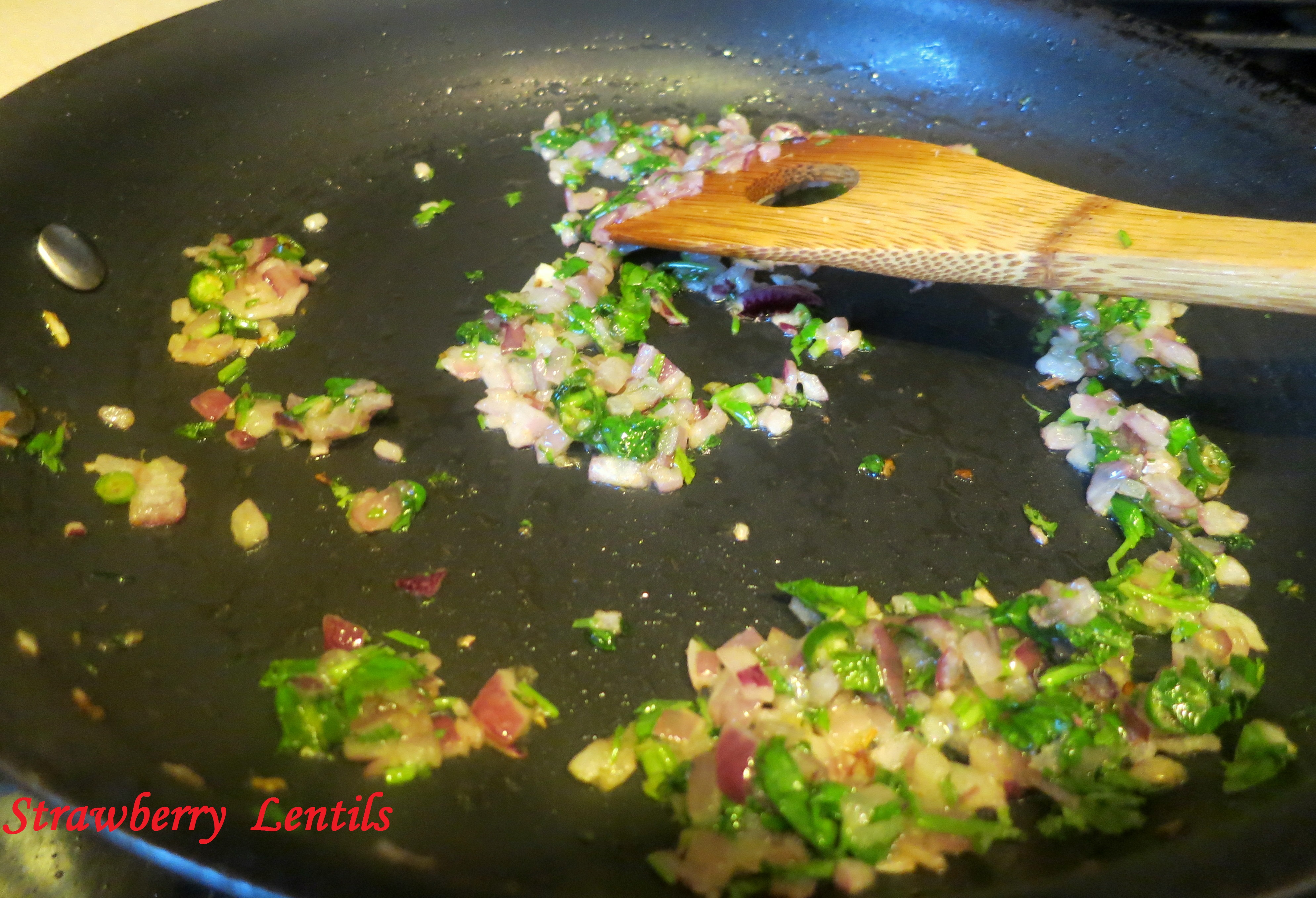 Sauté the onions, chillies, ginger garlic paste and cilantro.