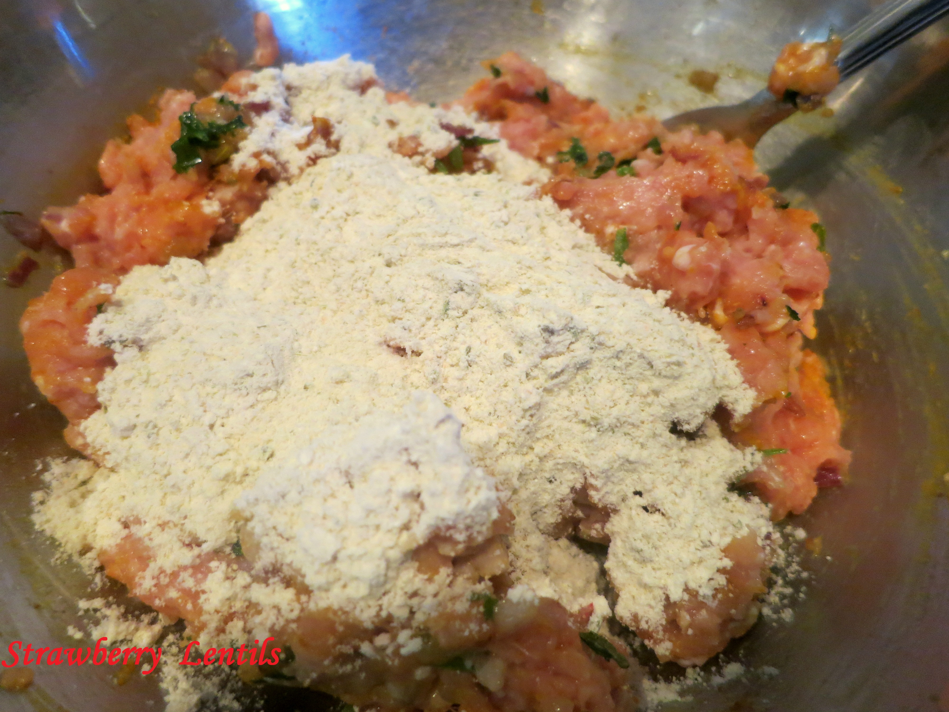 Add the roasted channa dal+fennelseeds powder to the chicken and mix well.