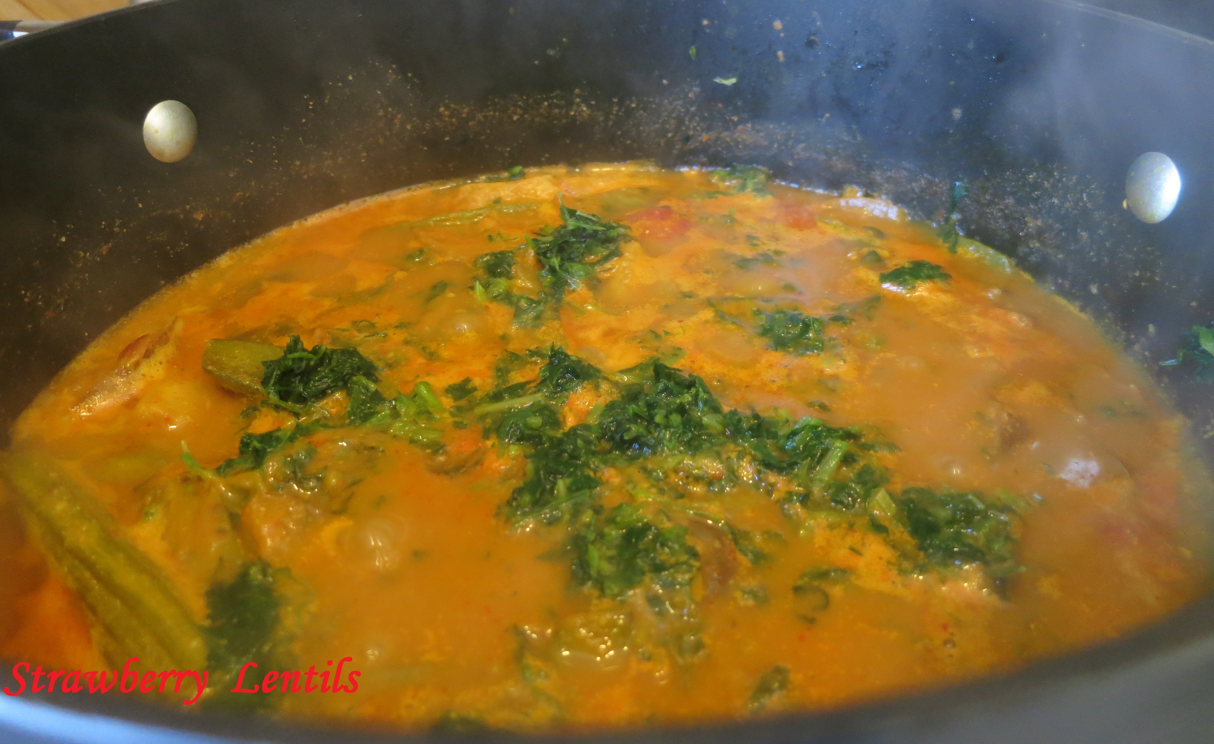 Traditionally, drumstick leaves are added. As I can’t get them in my place,I have added some chopped methi.