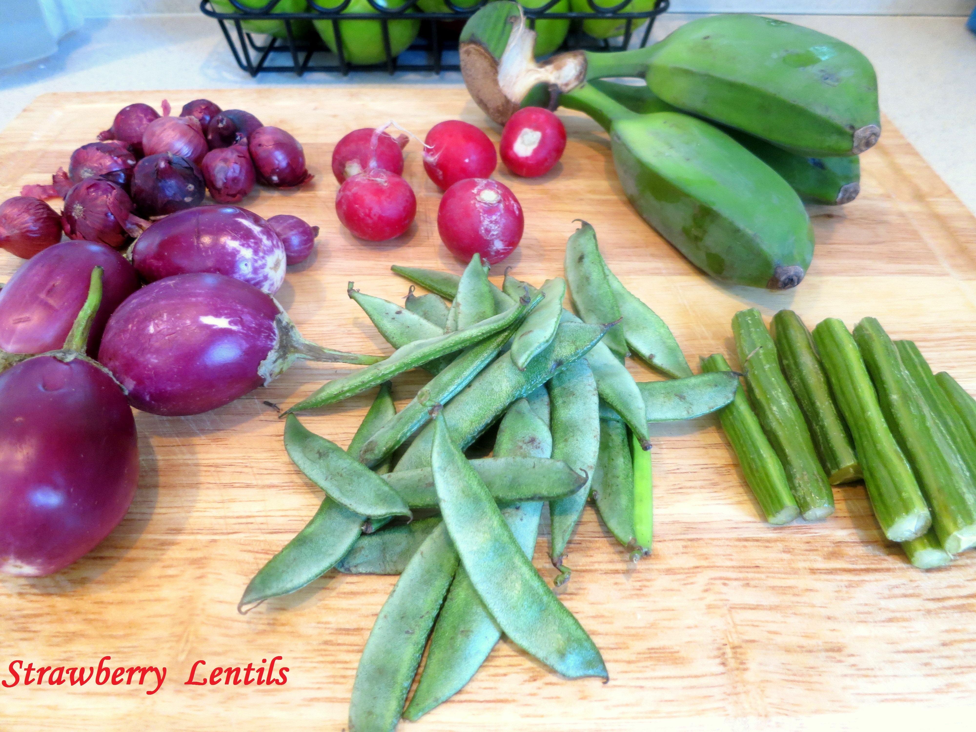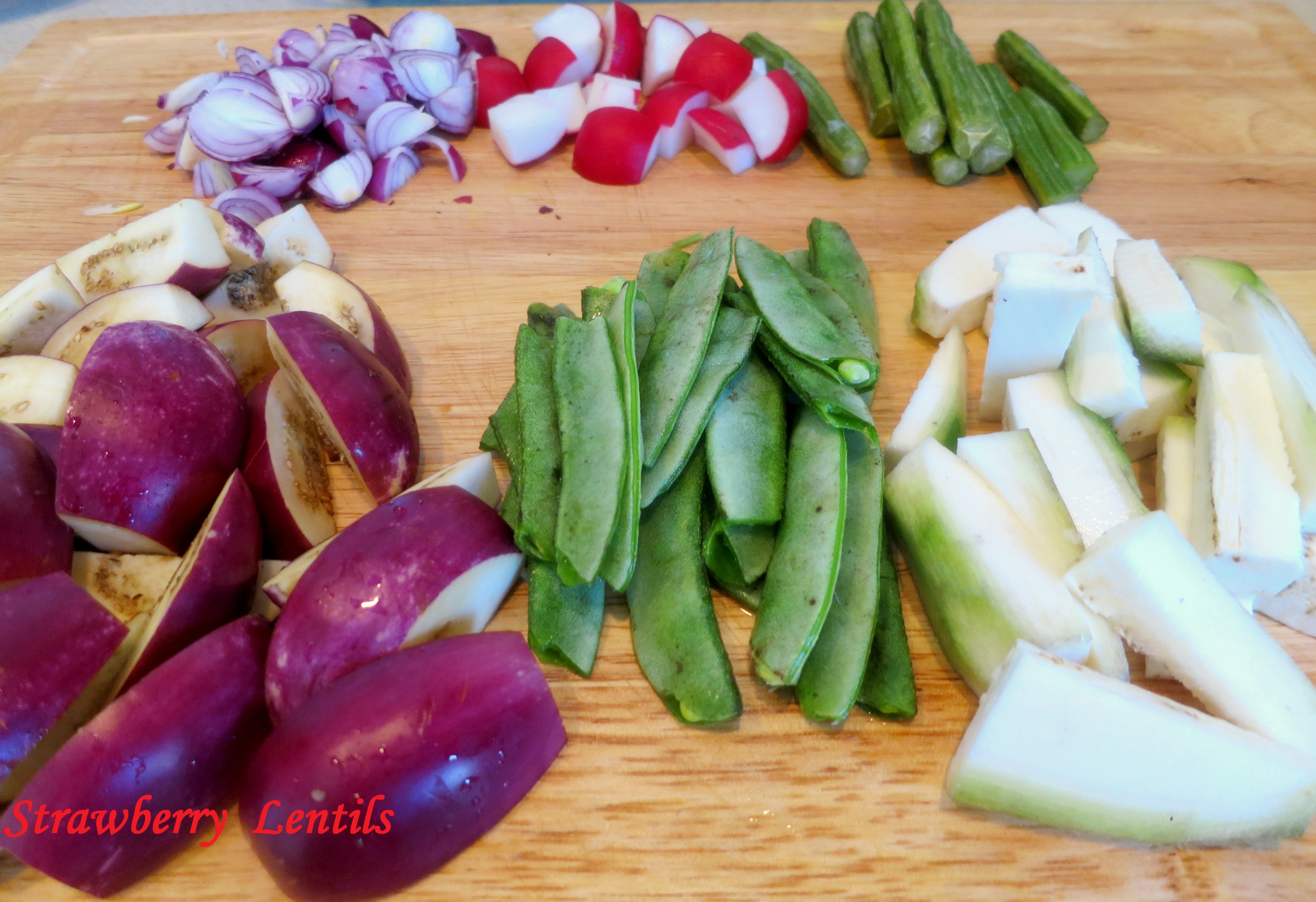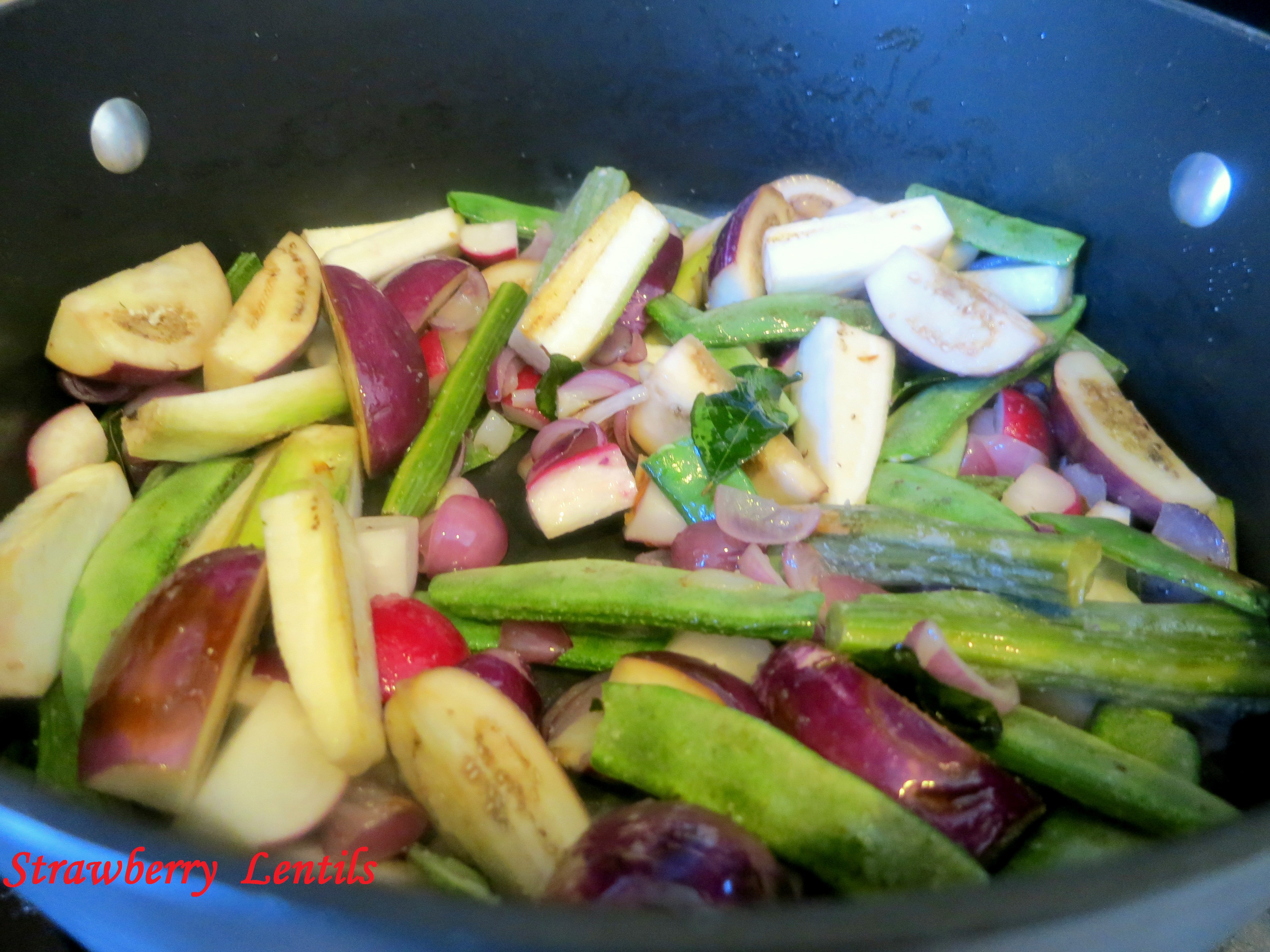 I have small onions, radish, cooking banana, eggplants, flat beans and drumsticks. Traditionally, we use what we call as “Naattu Kaai” for this rice and avoid vegetables like carrots, peas and cauliflower.