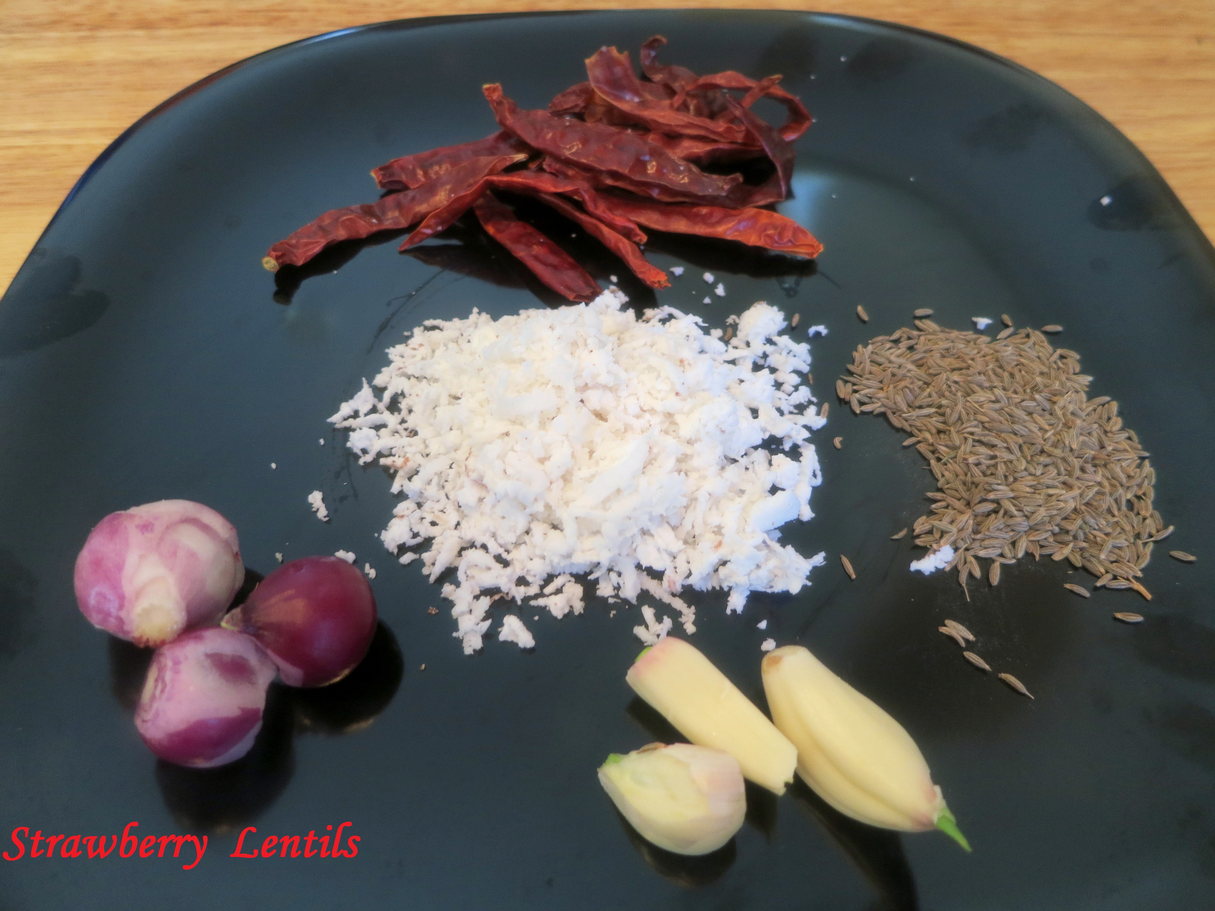 For the masala, grind red chillies, cumin, small onions, garlic and 1 tbsp. of coconut.