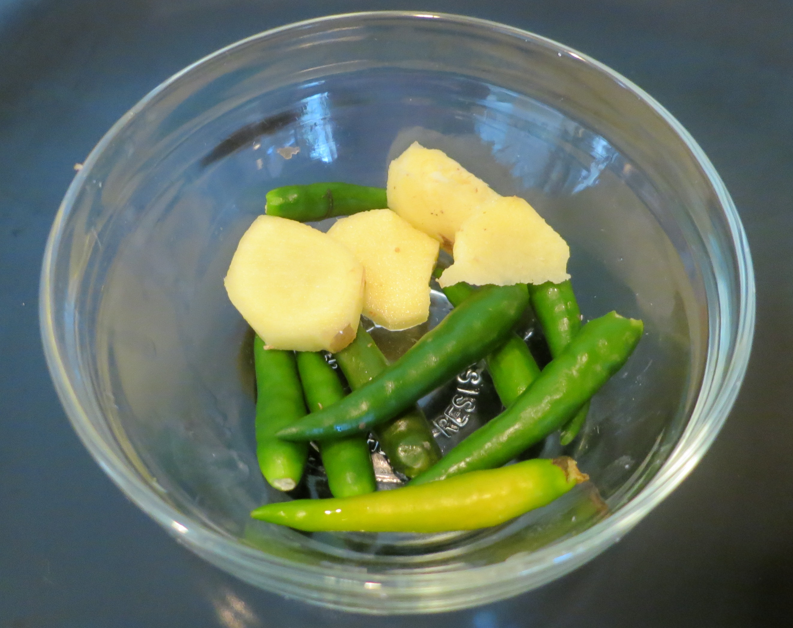 Grind green chillies + ginger to a paste. This will be the only source of heat for the stew, so take accordingly.