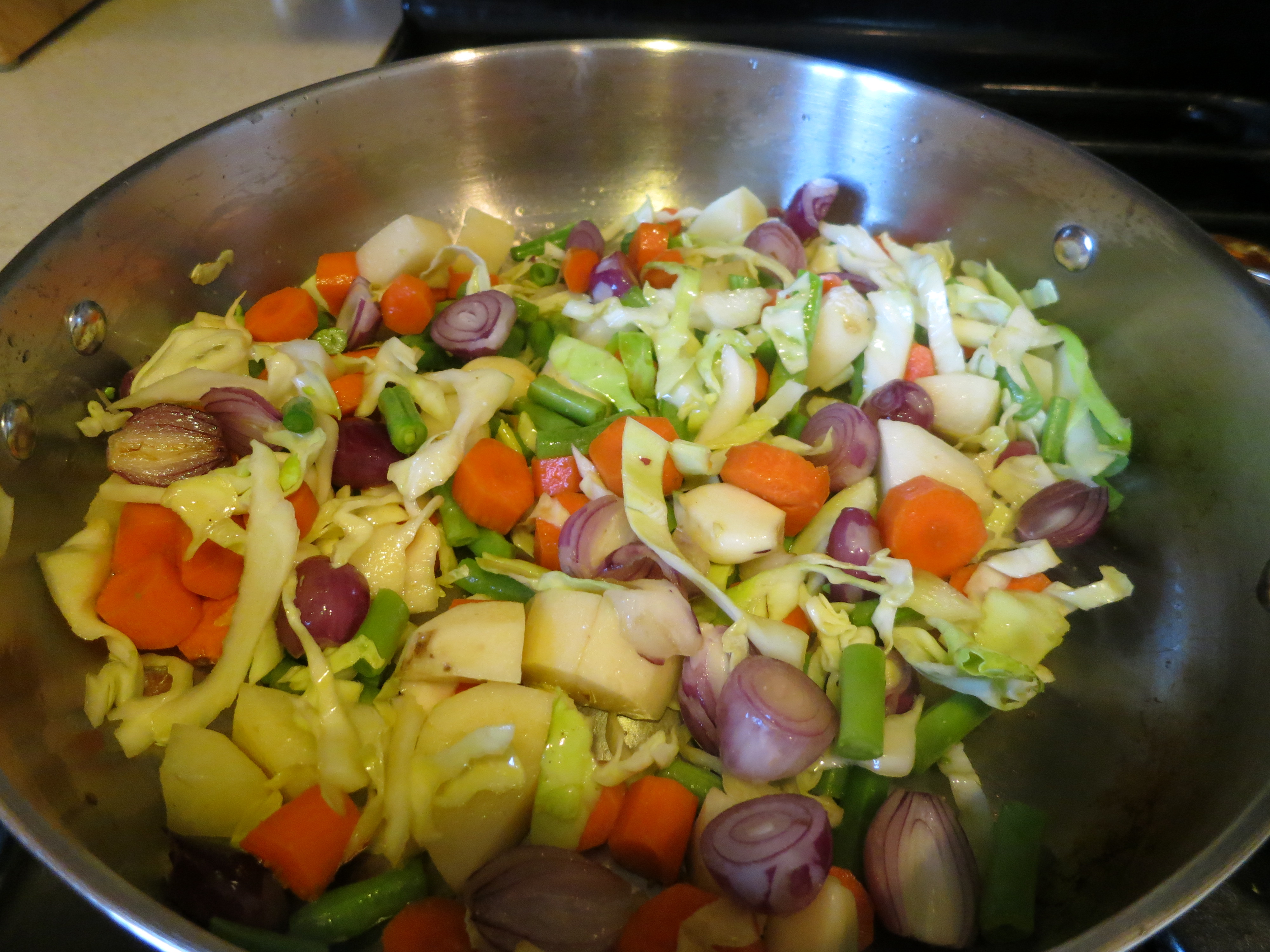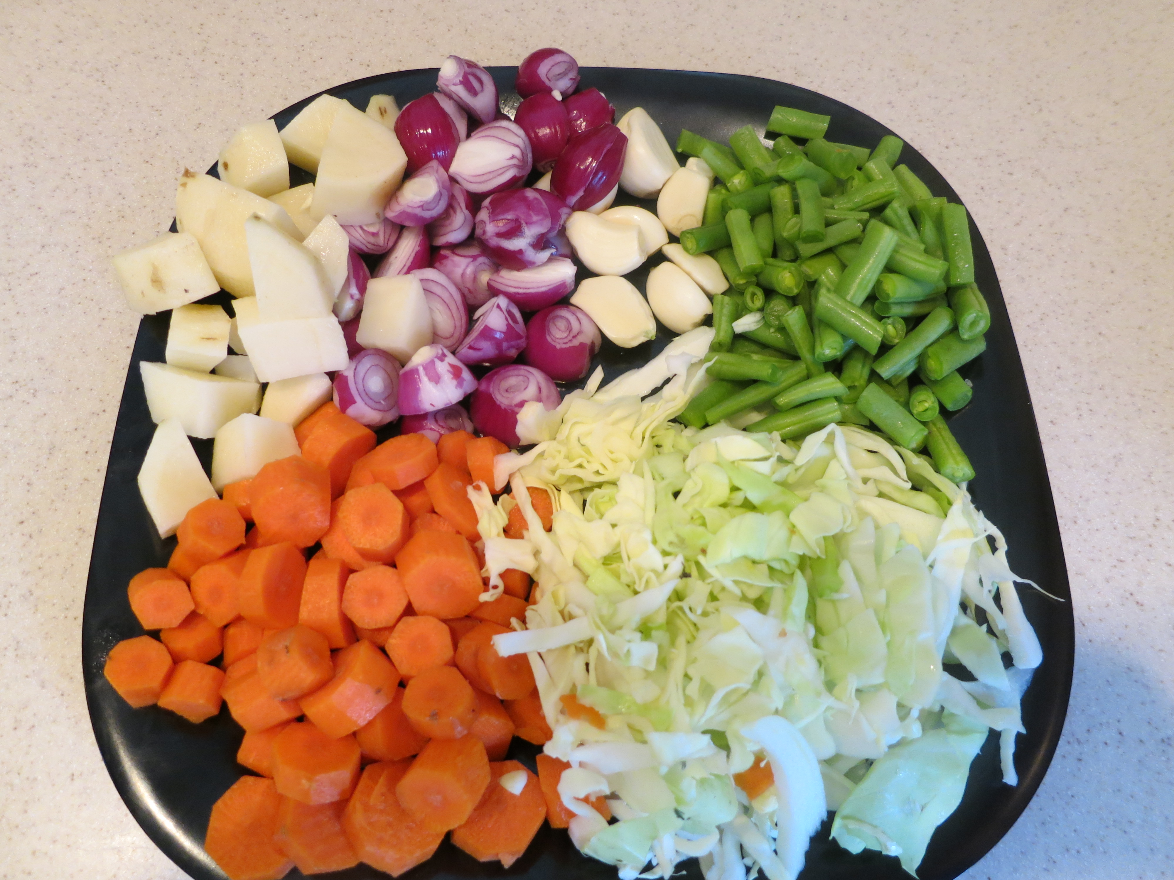 These are the veggies : pearl onions, garlic cloves, cabbage, carrots, green beans and potatoes. All the prep is done…and the rest is quite easy.