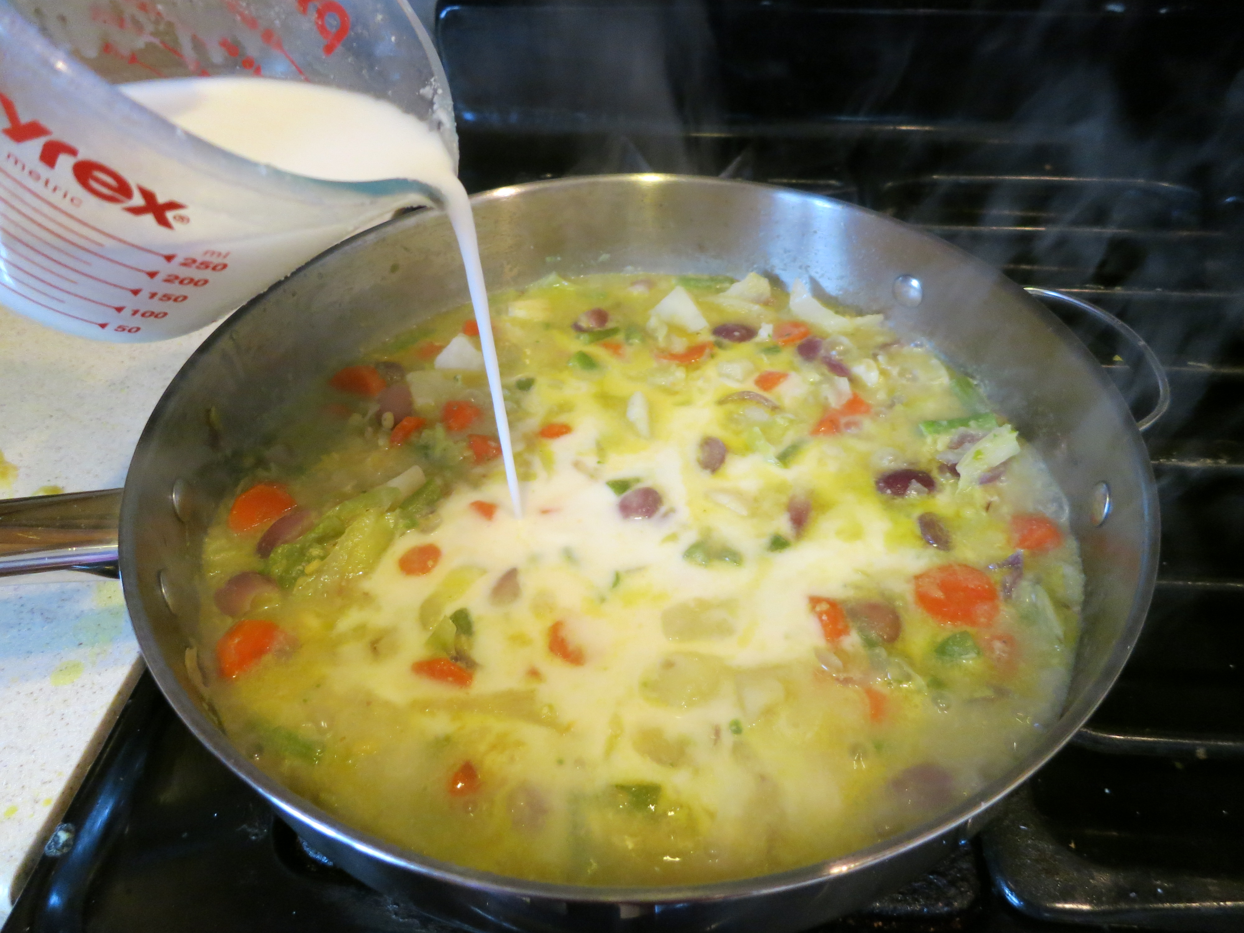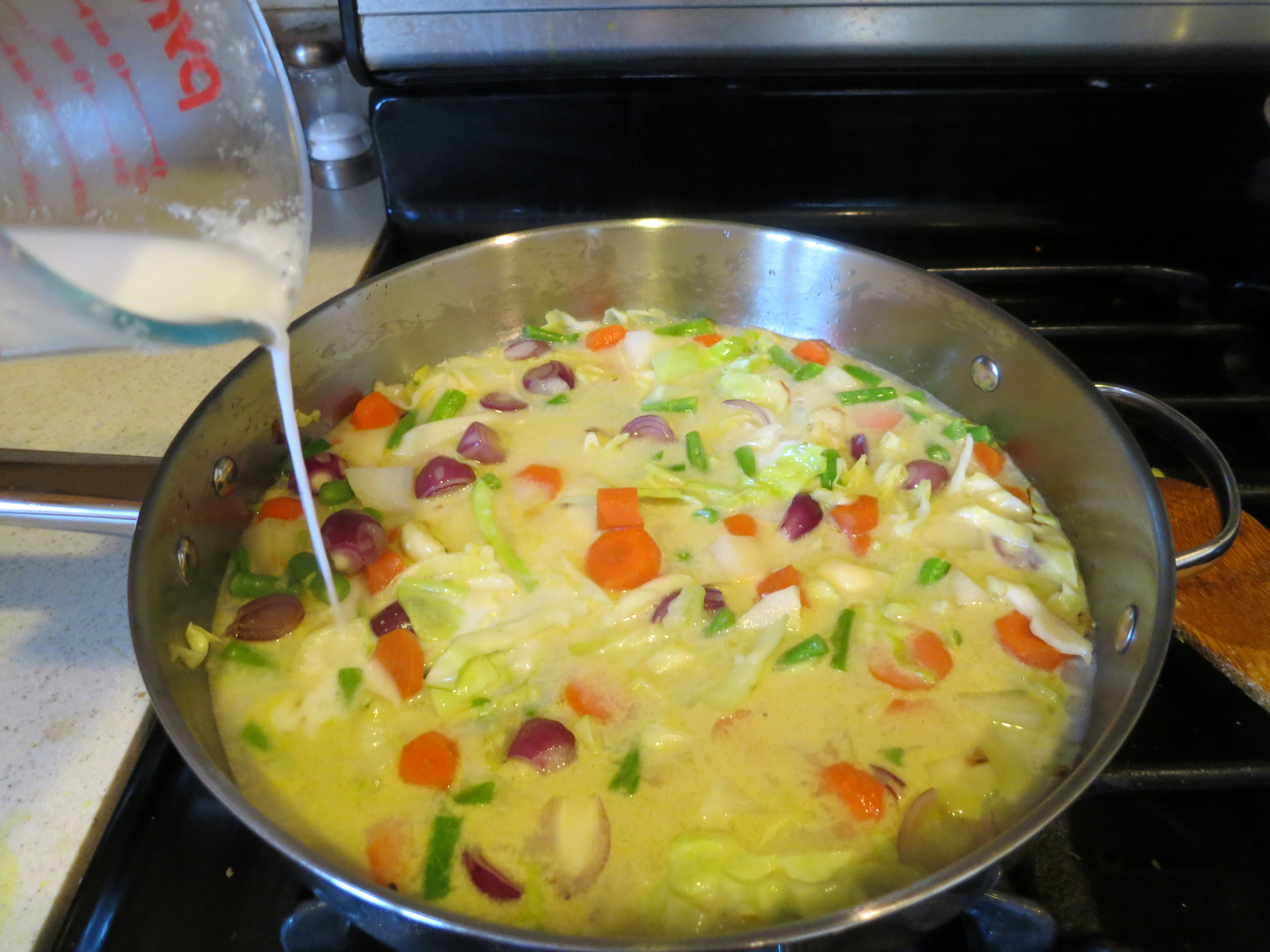 Reduce the heat to “low” and add the “first” coconut milk (the thick and creamy one). after you’ve added the thick coconut milk, do not bring the stew to boil. Just simmer it for five minutes.