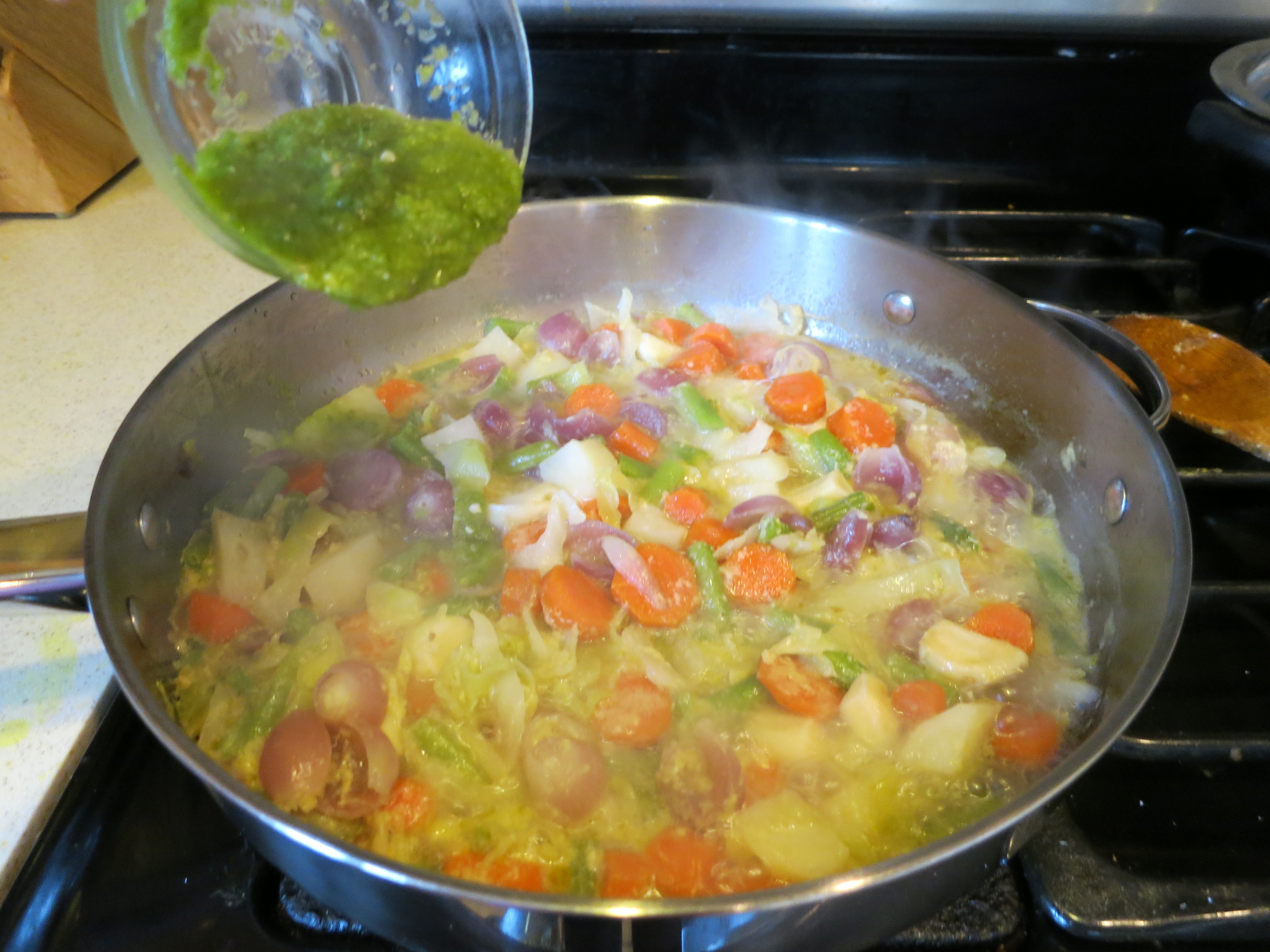Add a pinch of salt,, it is very easy to oversalt this stew, so add only a pinch at a time. Cover and cook. When the potatoes and carrots are 3/4 ths done, add the chillie ginger paste.