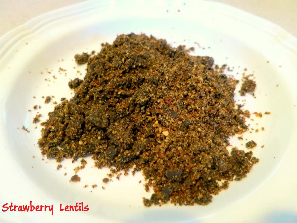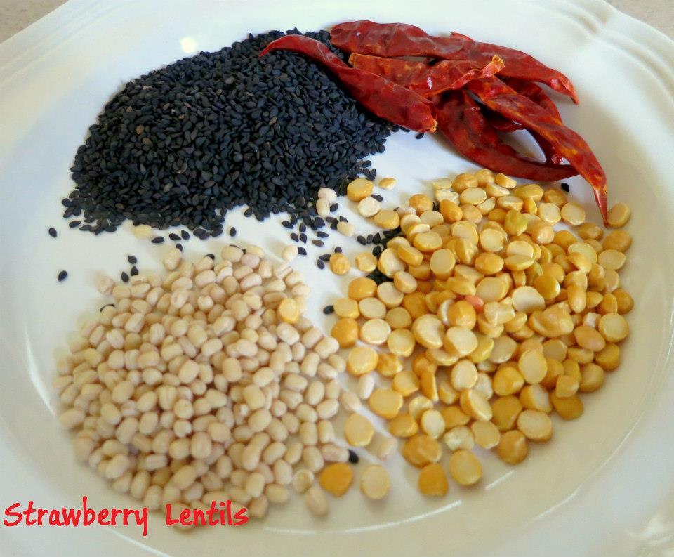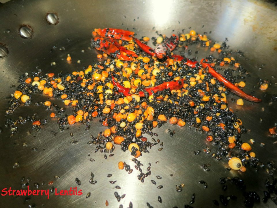 • black sesame seeds, red chillies, urad dhal and channa dhal