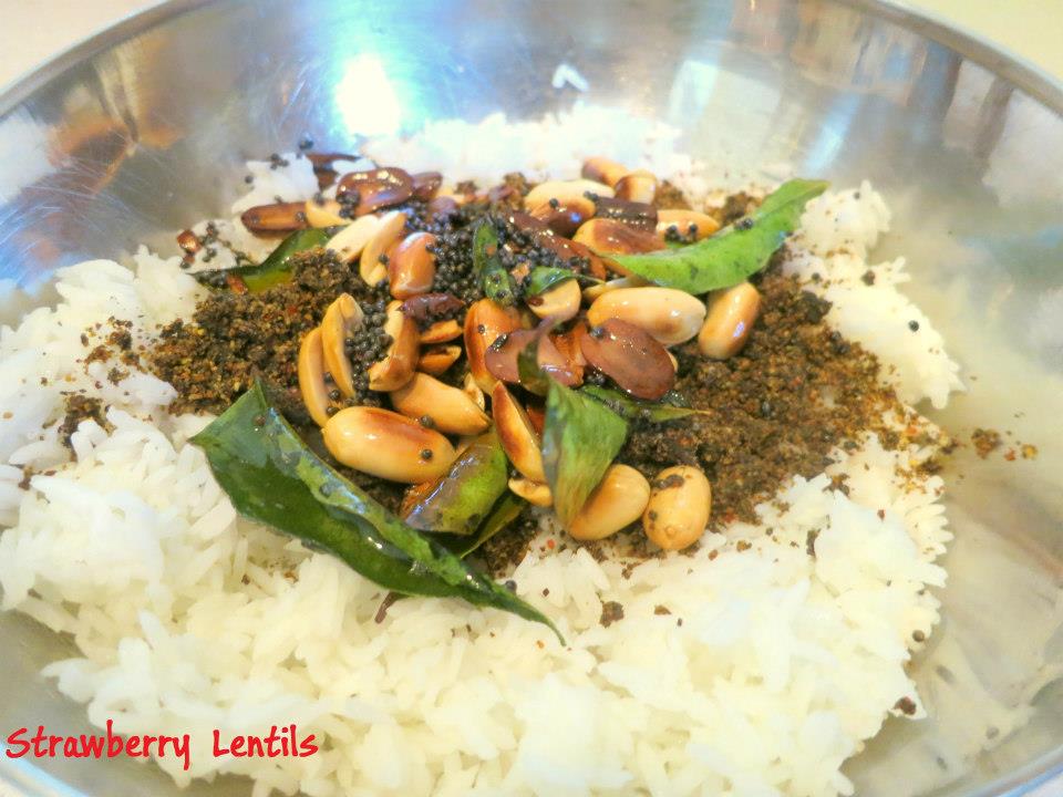 • Fry the mustard seeds, curry leaves and peanut in a tsp of sesame oil.