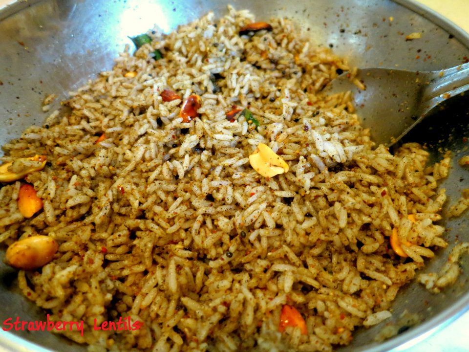 • To the cooked rice, add the sesame powder and the fried seasoning.