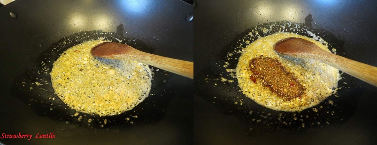 - Heat up 2tbsp of oil in the wok (you can use butter/ghee or a mix of ghee and oil) and fry the garlic paste. Take your time and cook until the raw smell is completely gone. And then add 1 tbsp of the kadai masala (dry spice blend) to the oil and fry for a few seconds. The rest of the kadai masala will be used at the end.