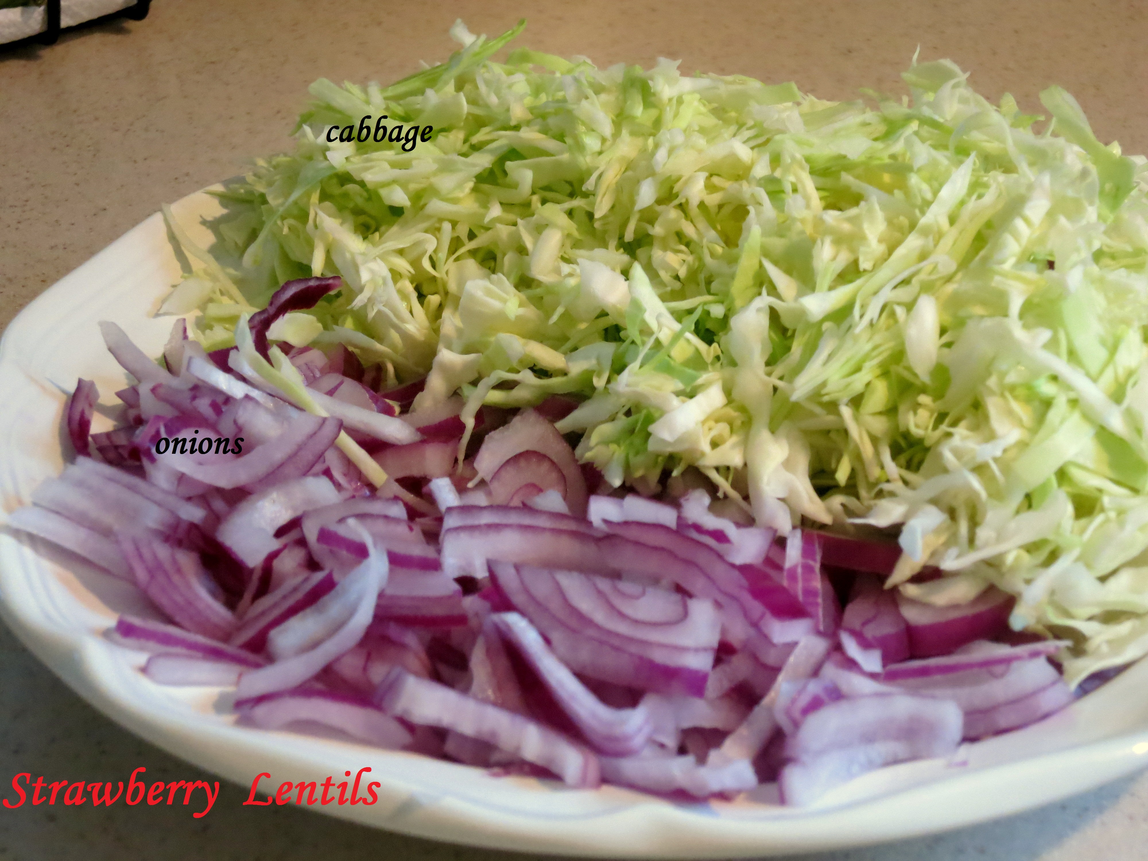 - First step is to make the filling. Slice the onions and cabbage thin and long.