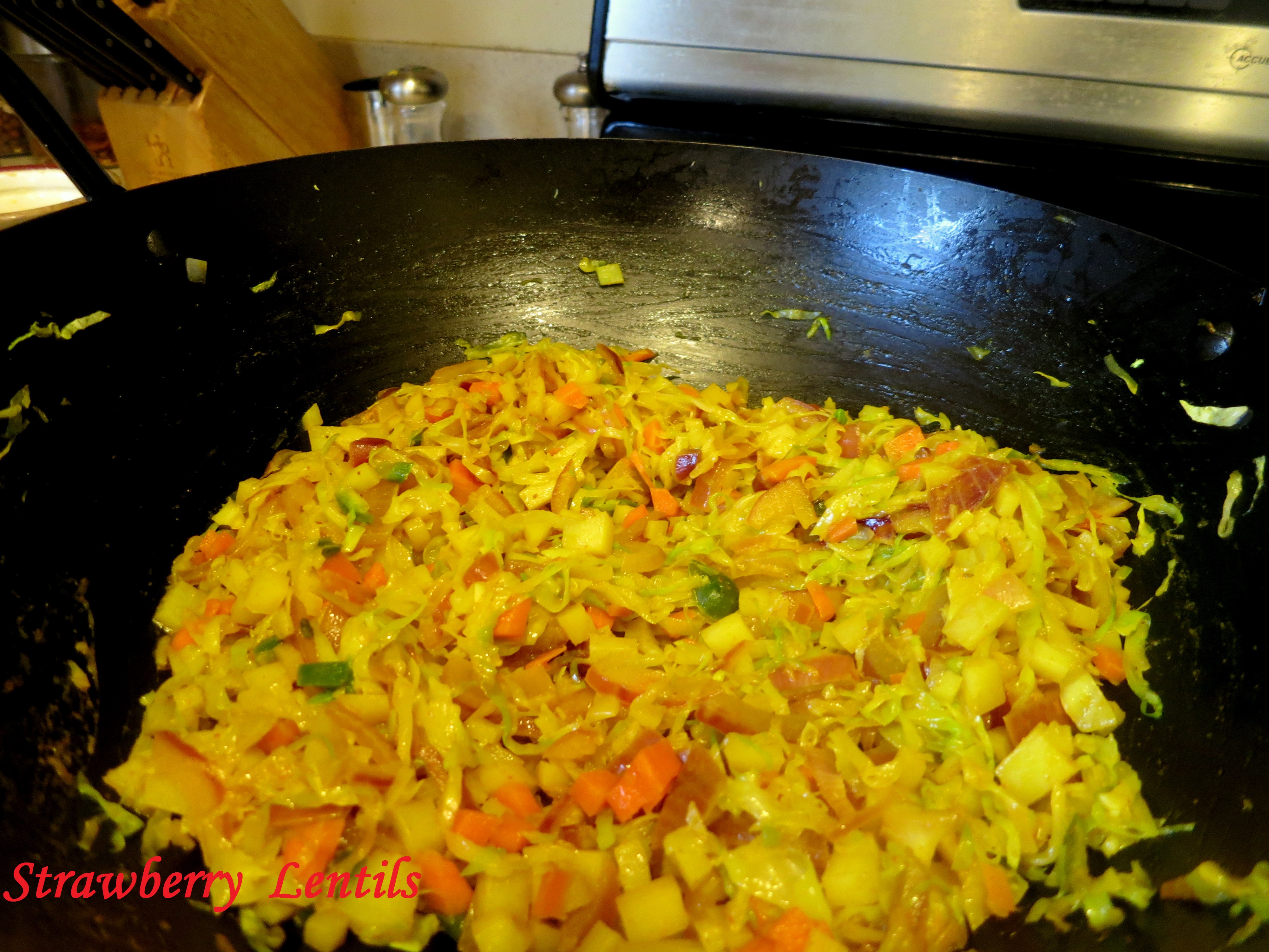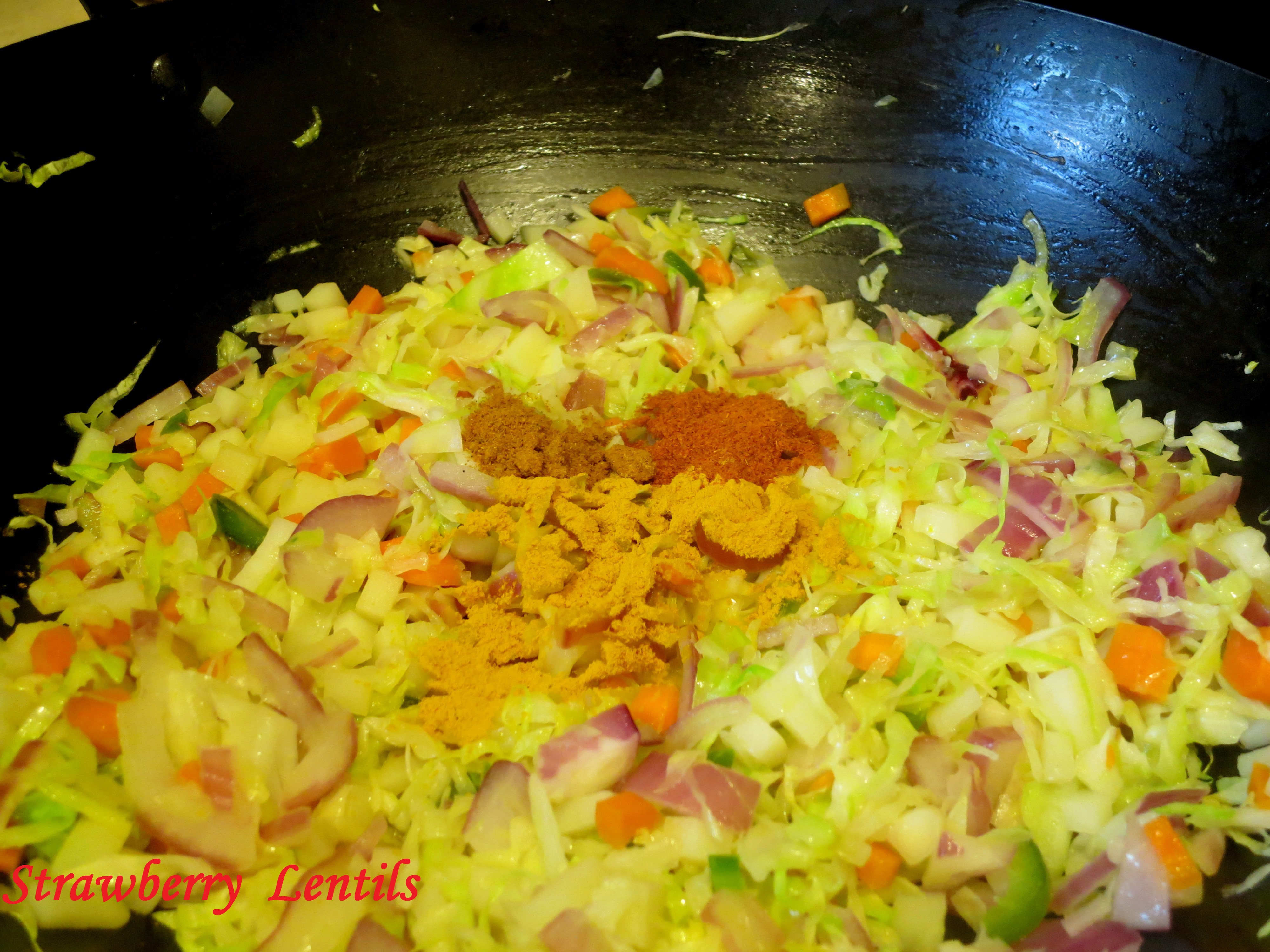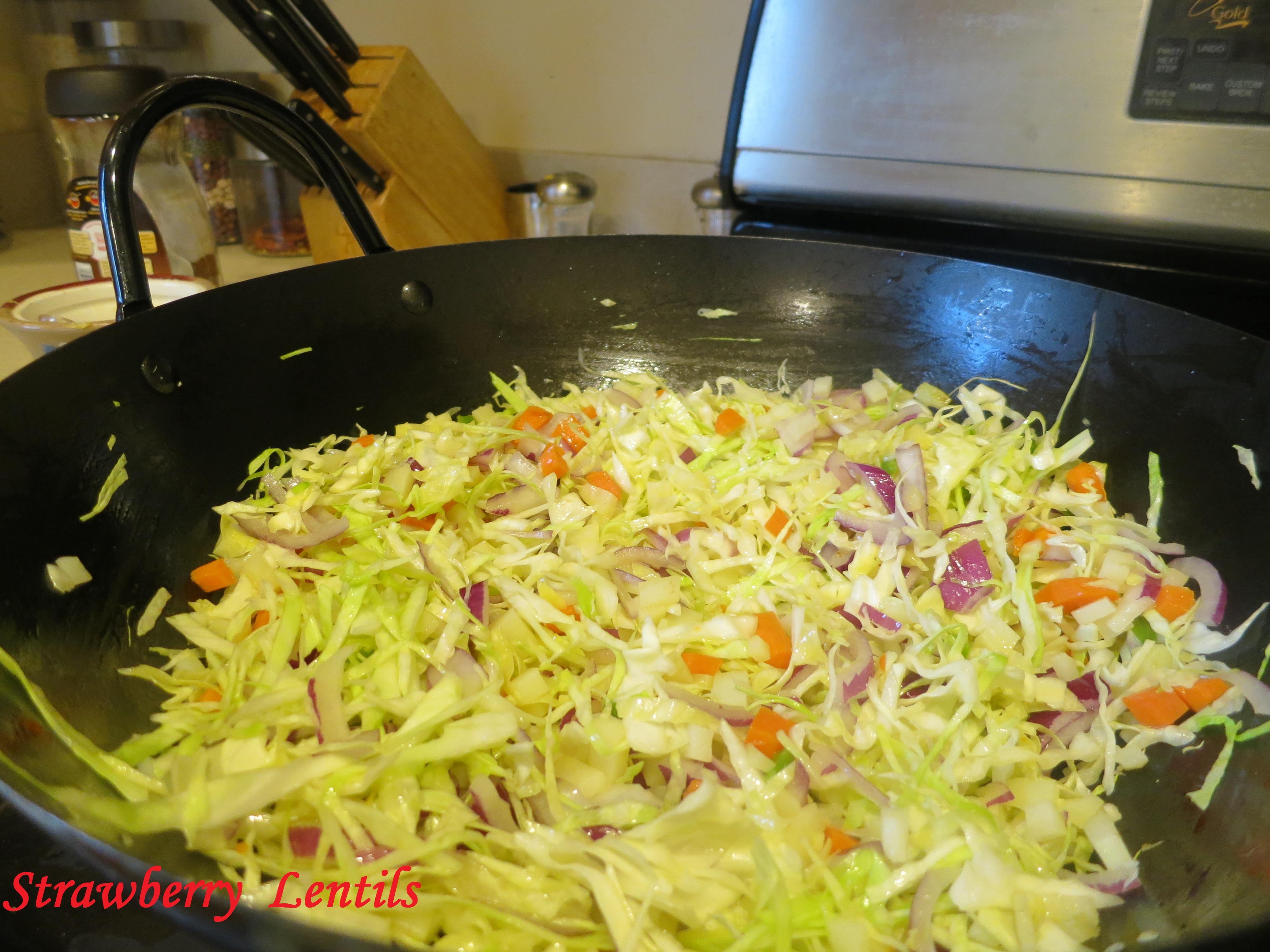 - Add the cabbage and onion together. It is very important to have the crunchiness of the onions and cabbage until the very end, so a quick stir fry for a minute is all the cooking that is needed.