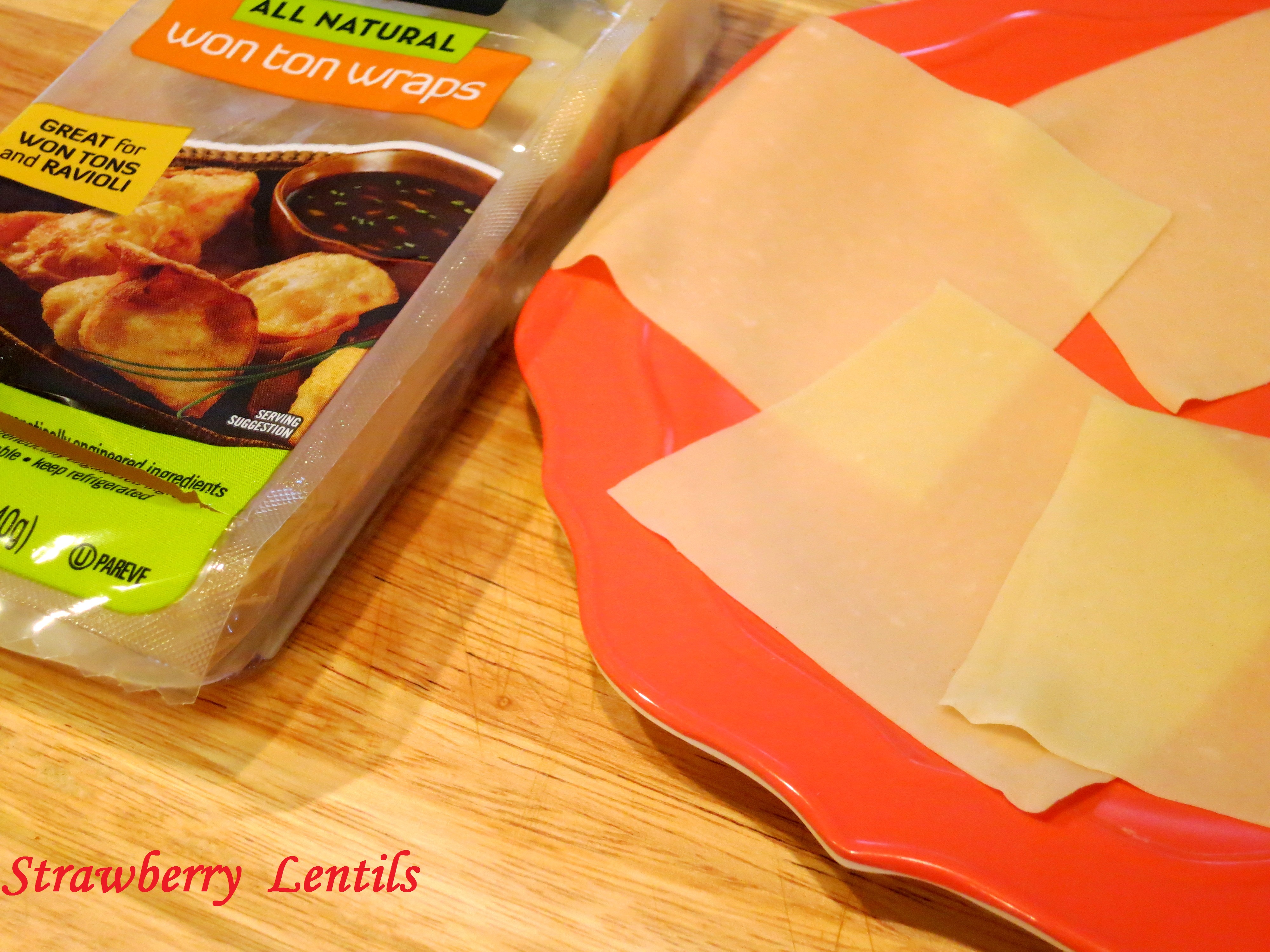 - For the outer covering, I am taking a shortcut by using wonton wrappers. I find these in the vegan section of my grocer right next to Tofu.