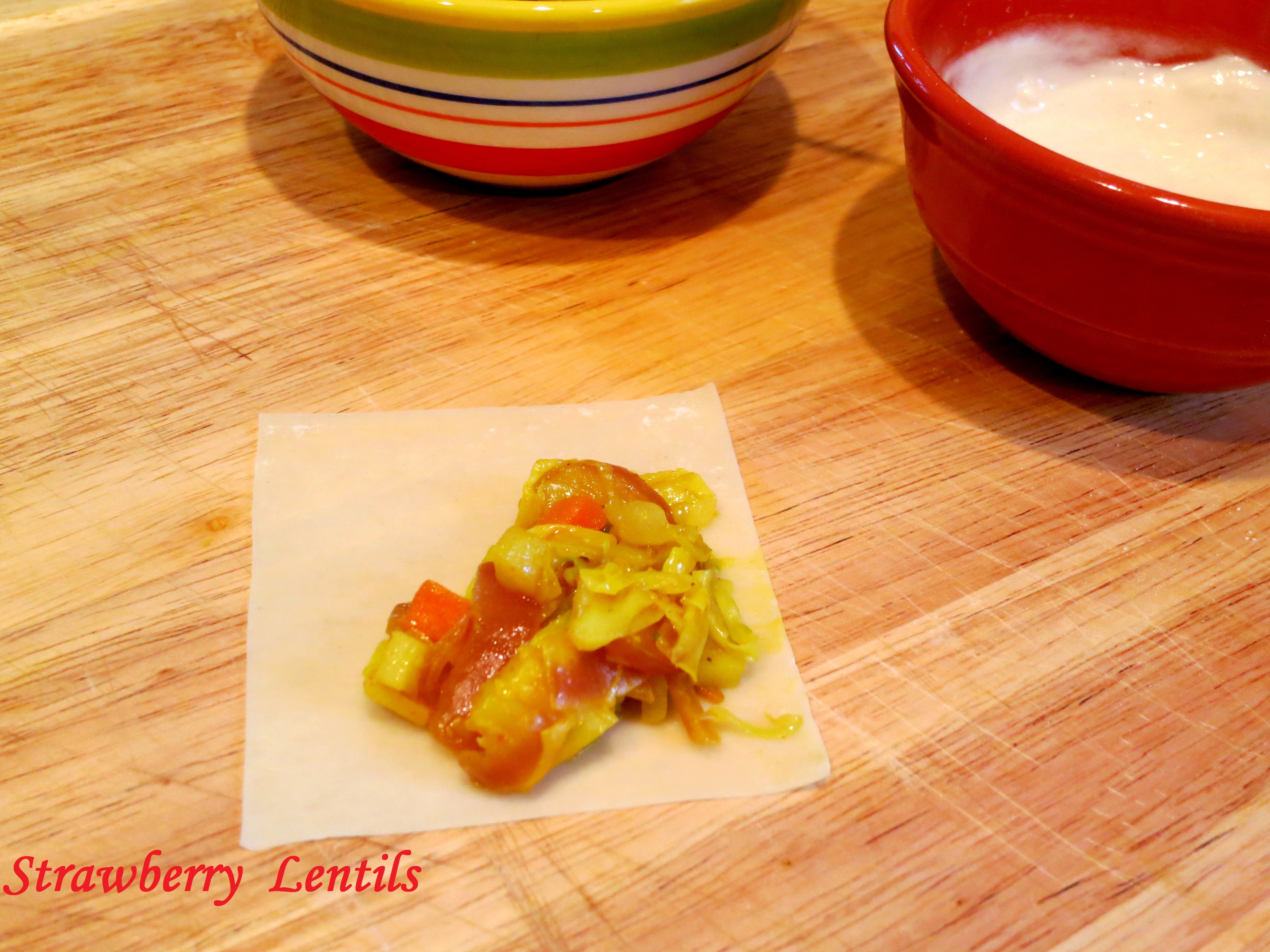 - In the wrapper, place the filling in one half (diagonally). If you place too much filling, the wrapper will rip, and too little filling makes for a tasteless samosa. But I assure you that you will find your happy medium by the time you are making your third samosa 🙂