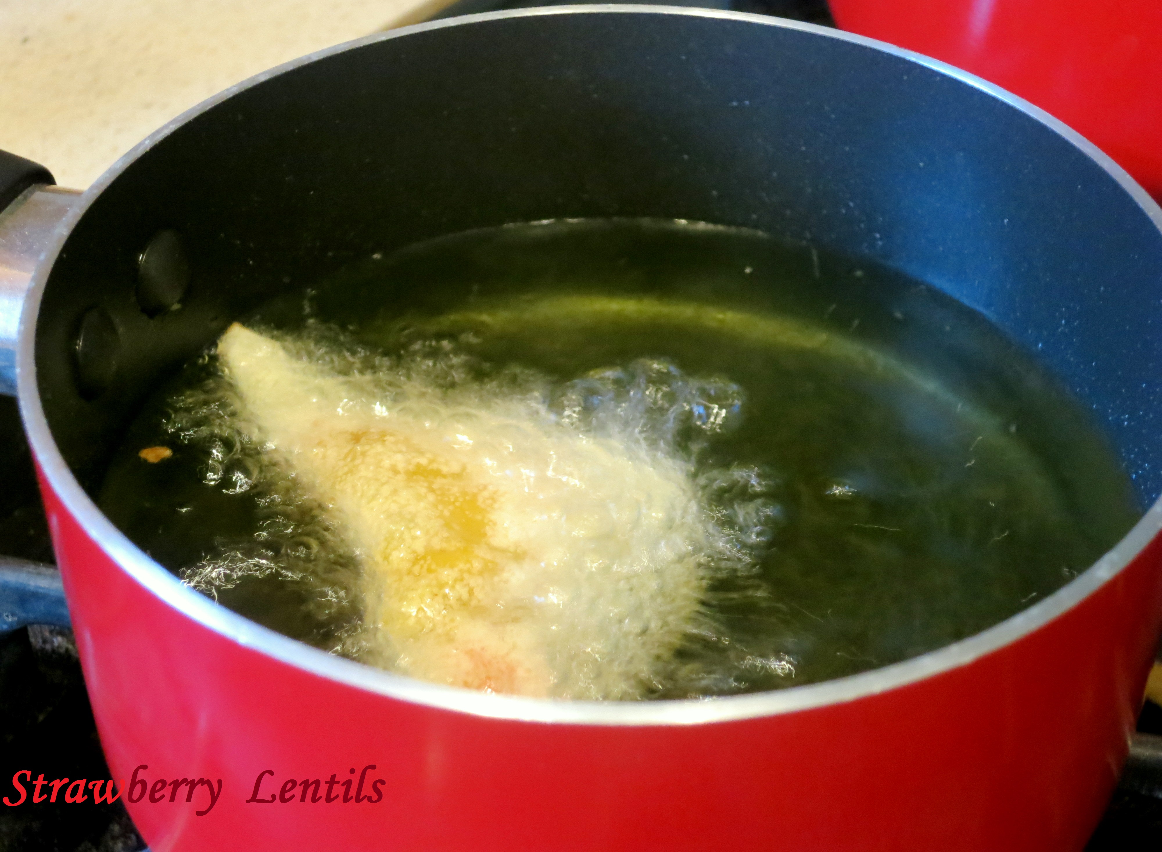 - Heat oil in a pan for deep frying and fry the samosas to a golden brown.