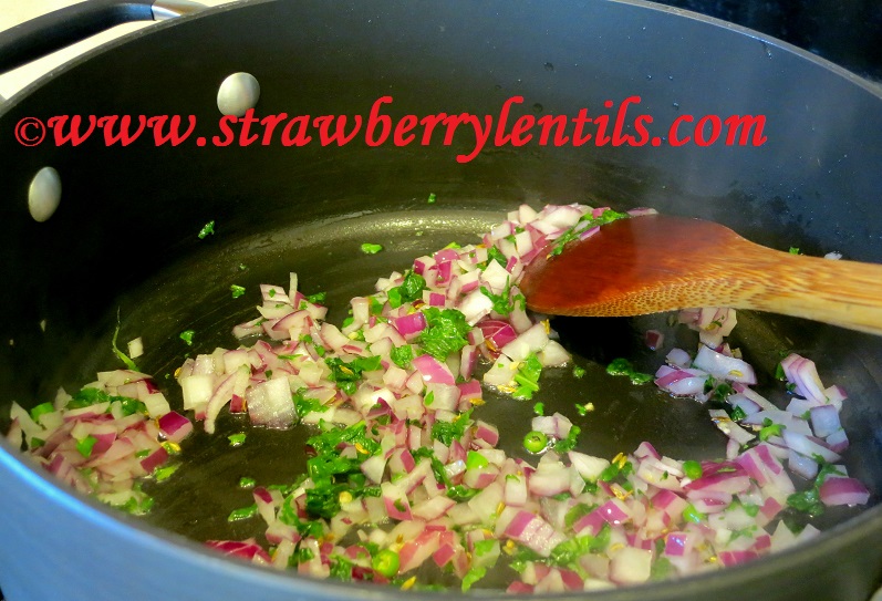 - Saute the onions , green chilli, and mint. After the onions become translucent, add a tsp. of ginger garlic paste and fry.