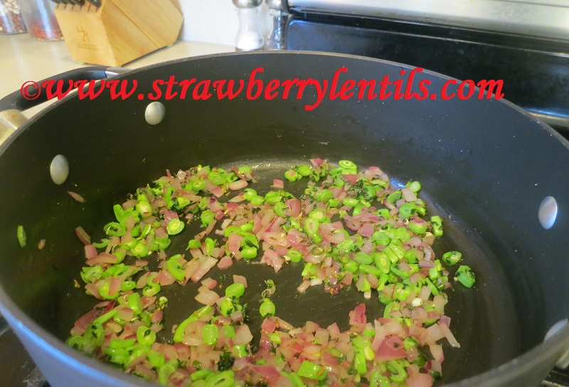 - Add the green beans and sprinkle some salt to sweat them.
