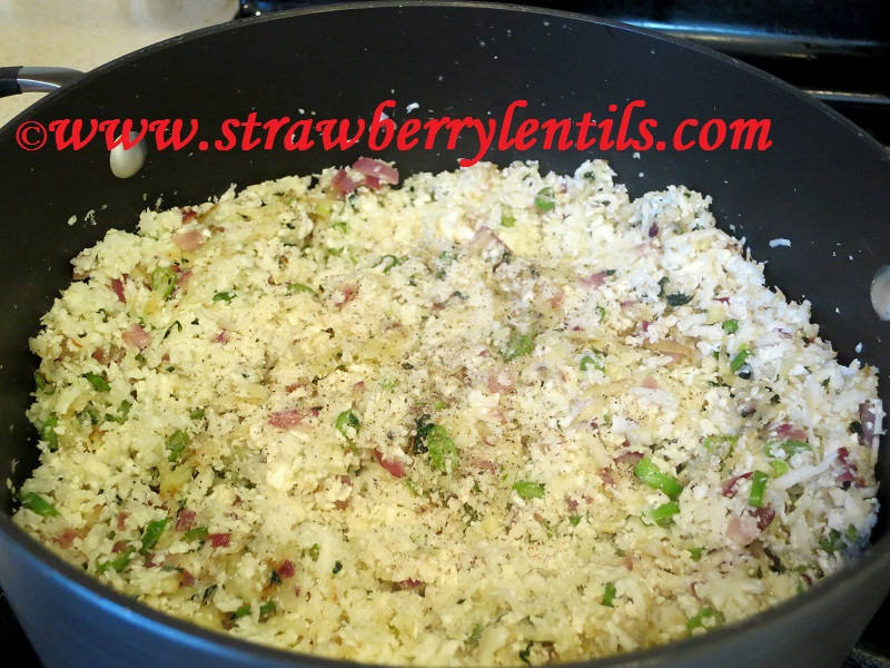 - Add the cauliflower at last as they will cook in no time. Add some salt and pepper, cover and cook for two minutes.