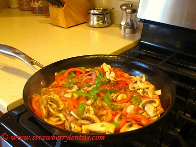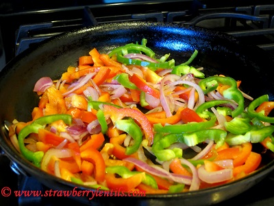 • Heat a tsp f oil in a skillet and saute the onions and peppers.