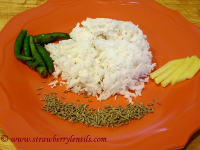• Grind the above ingredients without adding water. Grind them just enough that everything blends, no need to make a fine paste. This is the standard seasoning used in Kerala for the vegetable stir-fry (thoran). It is simple but fresh.