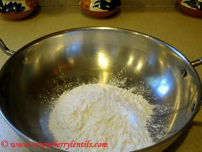 • Now to make the pathiris (pancakes), you will need the roasted rice flour. This should be available in Indian grocery stores in some version. Pathiri powder, Idiappam powder, Appam powder, puttu powder…..any of these can be used. If you can’t find it, just regular rice flour will work too, though there will be a slight difference in the softness of the pancakes.
