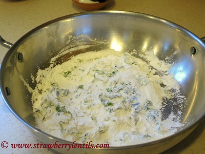 • To a cup of roasted rice flour, add salt, a tsp of oil and some chopped cilantro.