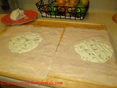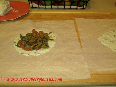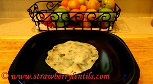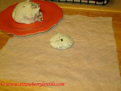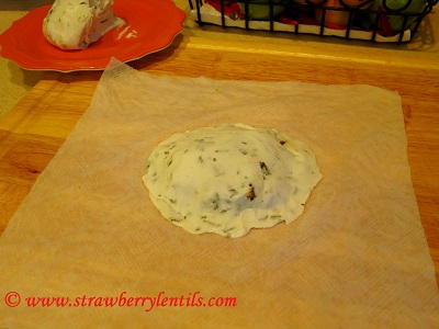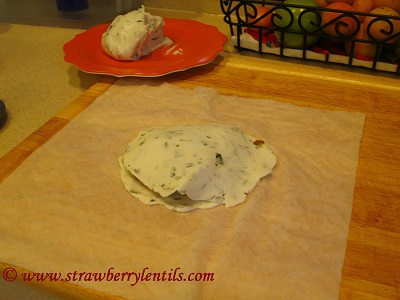 •  Place a small ball of dough on the wet paper towel and spread it with your fingers. Make two pathiris.