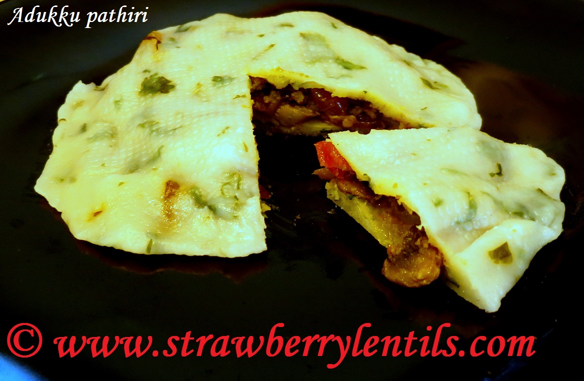 This is a Kerala recipe, Malabar to be precise. Pathiri is a pancake(steamed) made with roasted rice flour. “Adukku” means layers. The rice pancakes are layered with some filling (usually meat or sweet) in between them. I  made a veggie filling with my favorite vegetables and the typical kerala coconut seasoning. May seem like a lot of steps, but quite simple to make.
