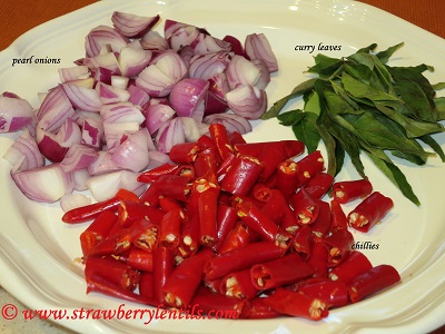 • You will need a cup of pearl onions. If they are smaller in size , you can add them as whole. The pearl onions I had were bigger in size, so I quartered them. Cut the chillies in half inch pieces. You will also need some curry leaves.