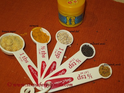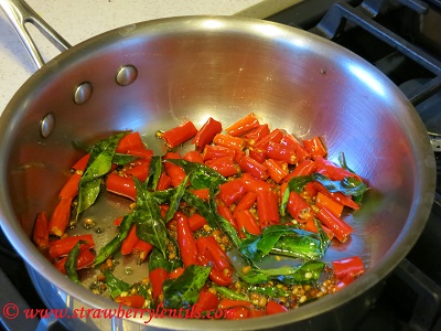 • Heat 2 tbsp of oil in a pan.  Fry the mustard seeds. Once they splutter, add the urad dal. When the dal turns to golden brown, add the fenugreek. Then fry the curry leaves and the chillies.