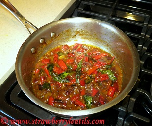 • Allow the curry to boil and reduce. Do not cover with lid. Any time you need to boil tamarind solution (for any recipe) you should not cover the pan with lid.