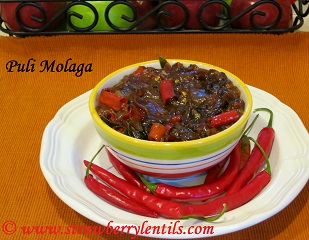 Puli Molaga is a simple side made by cooking the chillies in  tamarind sauce. You can think of it as the south Indian salsa and it is a multi purpose side that can be served with rice, rotis, idli/dosa or as a spread for breads and wraps.