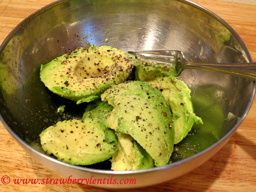 - The above quantities are for two ripe avocados. Scoop out the flesh of two ripe avocados. ย Add the juice of 1 lime. Crush 2 tsp of black pepper and 1/2 tsp of cumin and 1/2 tsp of fennel (fennel is my two cents ๐ ) and add to the avocados and also add salt.