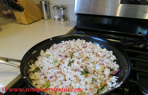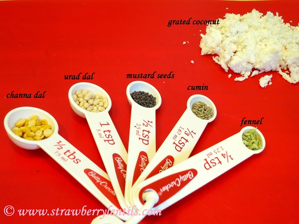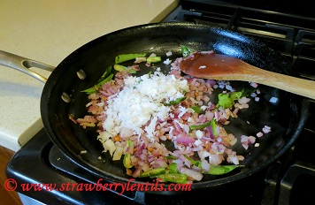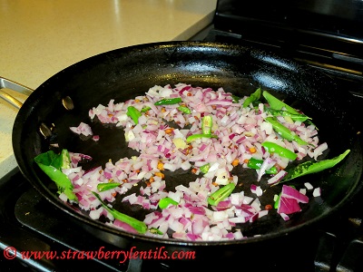• Once the onions brown lightly, add the grated coconut, toast for a few seconds and turn off the heat.